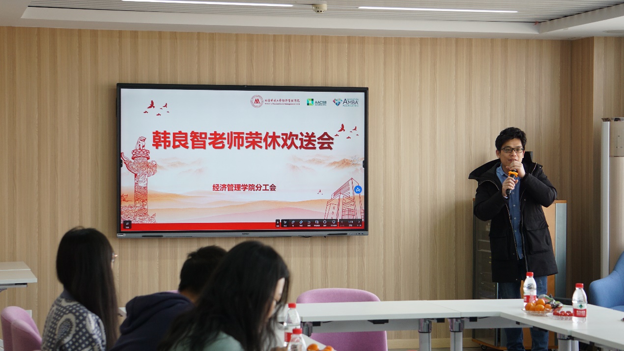荣休会由学院院办、院分工会和财会系共同筹办,由财会系黄秋彬老师主持,学院领导、教师等30余人齐聚经管楼1205房间,共贺韩老师光荣退休,并送上了诚挚的祝福。