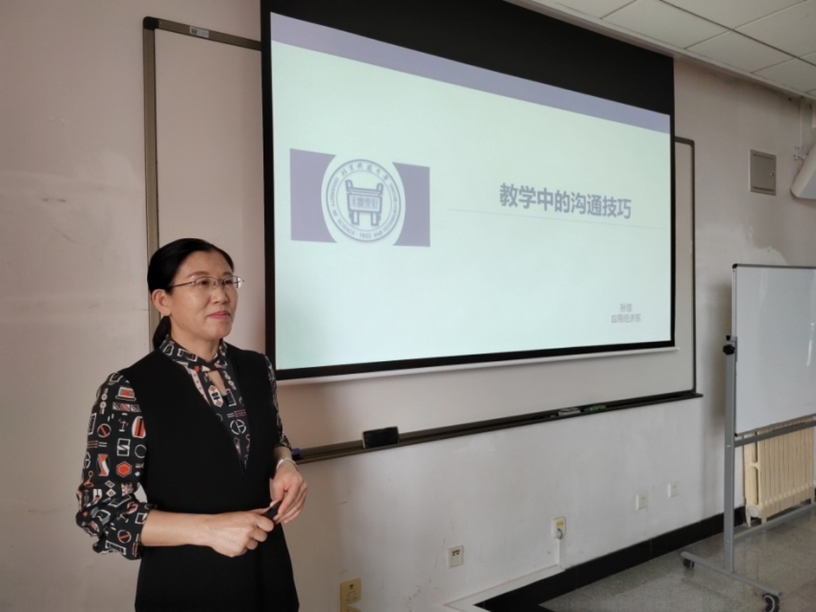 作为应用经济系系龄最长的老同志,北京市高等学校教学名师、应用经济系教授孙莹老师,以“教学中的沟通技巧”为题,深入浅出地介绍了教学中与学生沟通的经历和感悟,并指出有效沟通的核心是尊重,为师者,应具备良好的素质,优良的品德,高尚的行为,成为学生的榜样,学习的典范。要以积极向上的生活态度,高尚纯洁的人格魅力去感染学生,使得学生们愿意追随,并以此为学习的楷模。