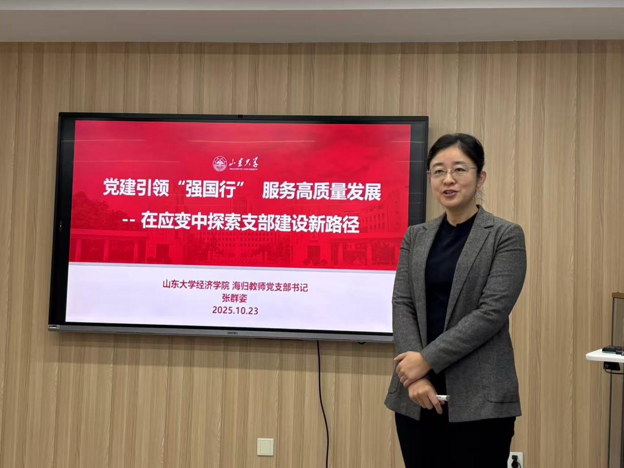 张群姿教授以“党建引领‘强国行’服务高质量发展--在应变中探索支部建设新路径”为题,系统讲述了如何实现党建引领学科高质量发展。结合山东大学经济学院海归教师党支部的具体实践,从以下三个方面展开交流:在全面深入学习方面,提出支部的“三位一体”学习模式。在聚焦问题精准调研方面,强调精准施策促进党建工作高质量发展。在党建引领促进发展方面,打造全国性党建标杆品牌“中国金融湖畔论坛”。
