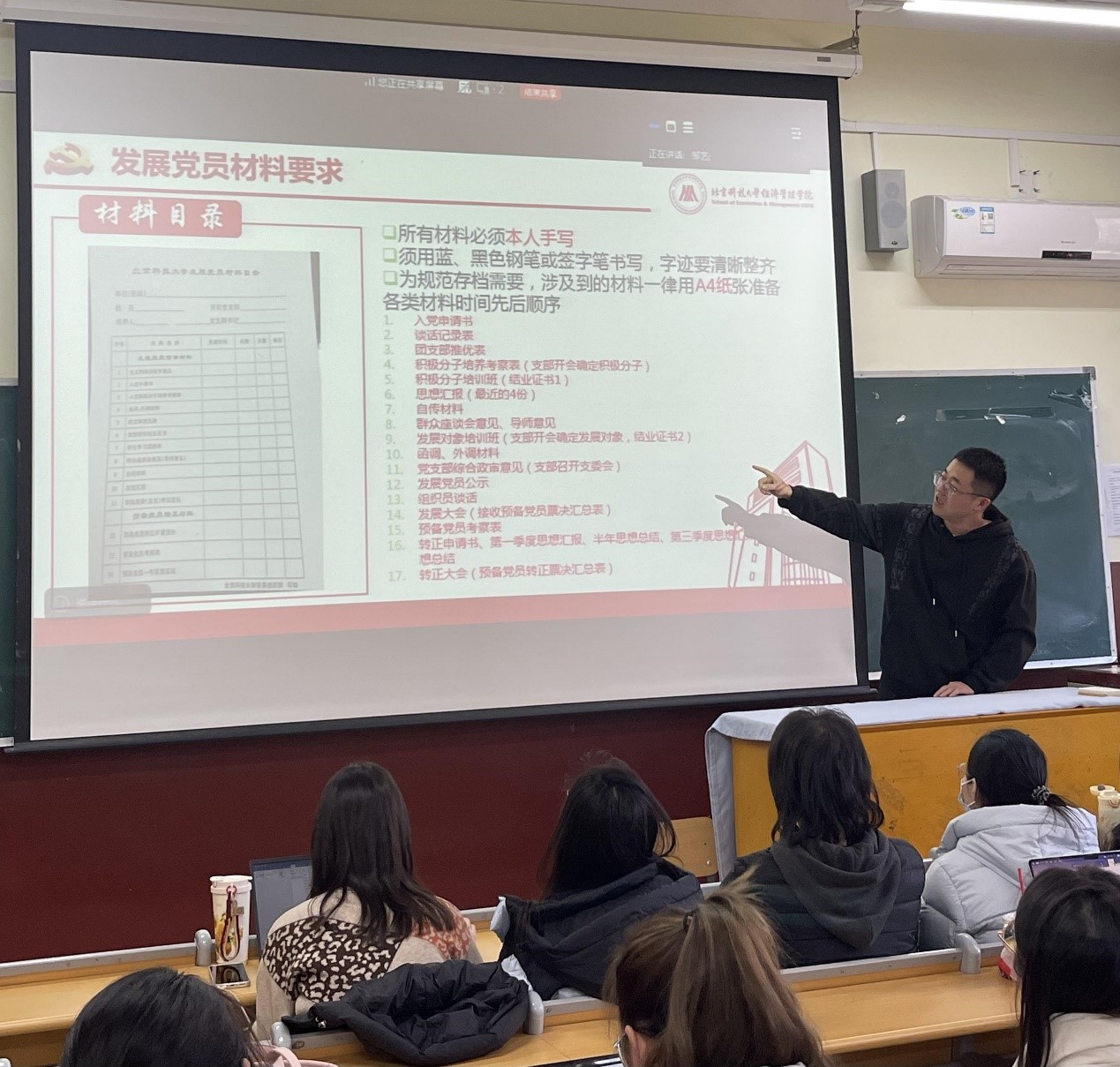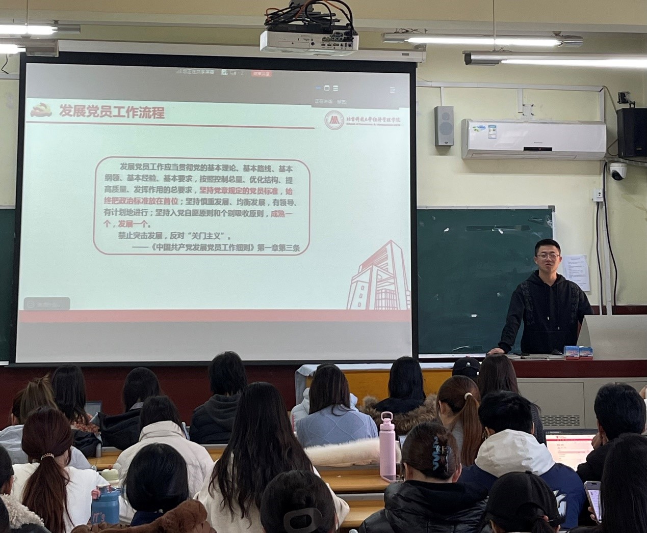 2025年12月4日下午13:00,beat365英国官方网站在管庄校区教学楼204组织开展新生党员及入党积极分子培训活动,旨在系统介绍党员发展规范及材料要求,强化学生党员的政治素养与纪律观念。活动由学院辅导员邹艺主讲,全体研25级新生党员及入党积极分子参加。