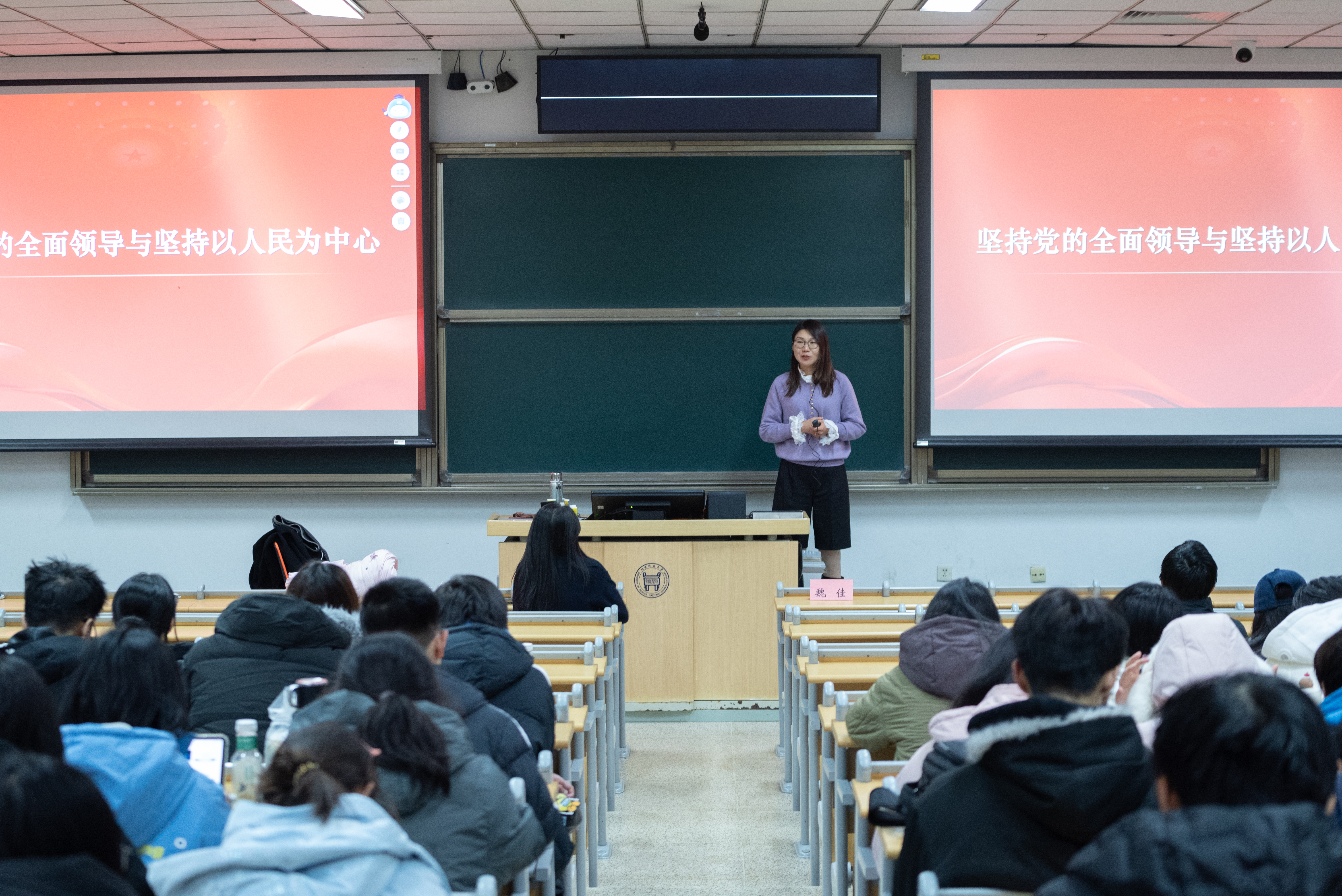 围绕“坚持党的全面领导”,魏佳援引党的十九届六中全会决议,详解“两个确立”的决定性意义与“两个维护”的核心内涵。通过毛泽东同志“桃子的故事”、《没有共产党就没有新中国》创作背景等案例,结 合遵义会议等历史节点,印证党的领导的根本性作用。谈及“坚持以人民为中心”,魏佳结合习近平总书记在浦东开发开放30周年庆祝大会上的论述,指出其核心是“把人民对美好生活的向往作为奋斗目标,依靠人民创造历史伟业”,以脱贫攻坚、民生改善等实例说明理念的实践逻辑。