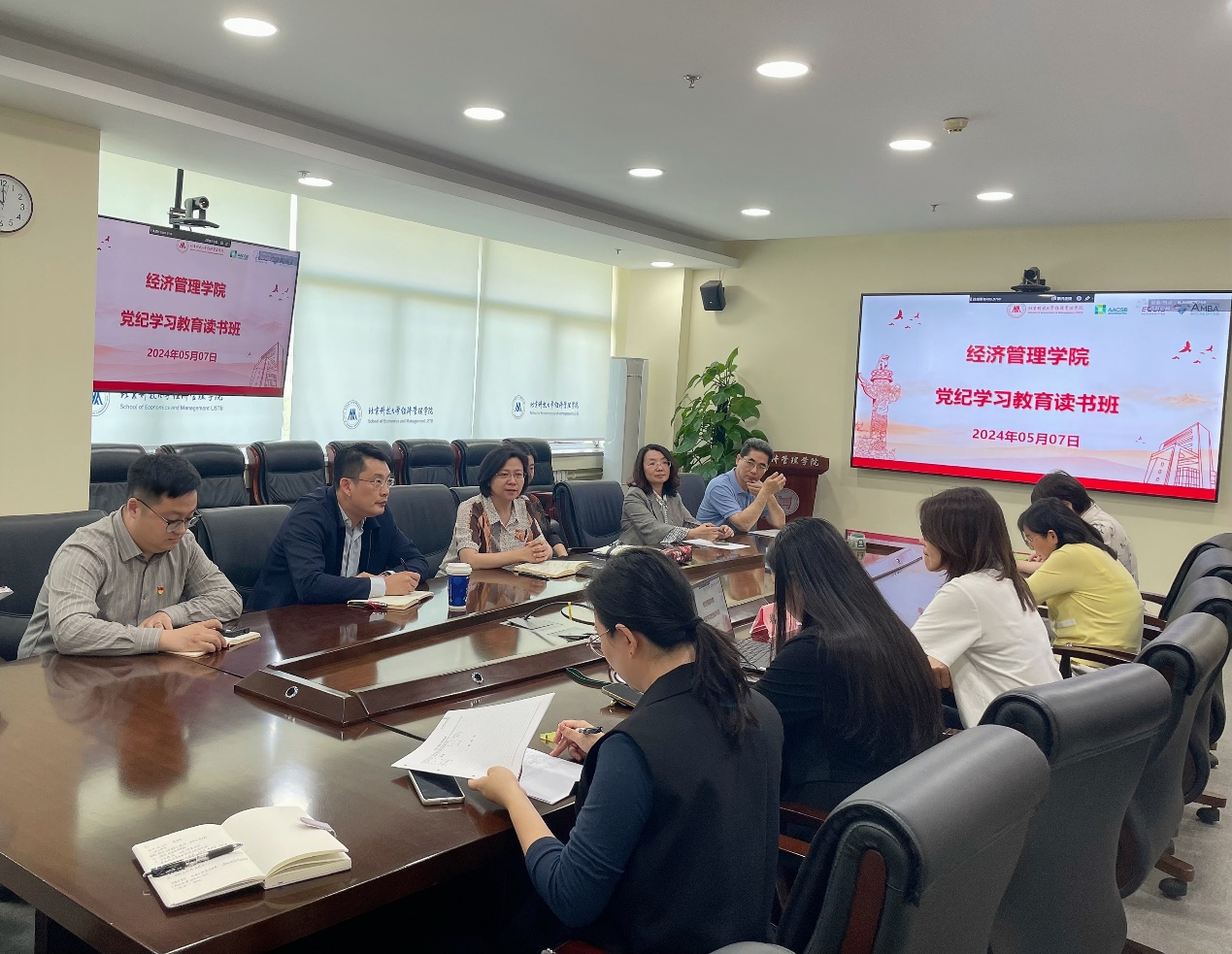 为深入学习领会习近平总书记关于党的纪律建设的重要论述,原原本本学好《中国共产党纪律处分条例》,推动党纪学习教育走深走实,5月7日,beat365英国官方网站党委举办党纪学习教育读书班。读书班以专题导学、个人自学相结合的形式分阶段开展。读书班由党委书记武森主持,邀请理论学习导师、马克思主义学院魏佳副教授作专题导学,学院党委委员、教工党支部书记和党委秘书参加集体学习。