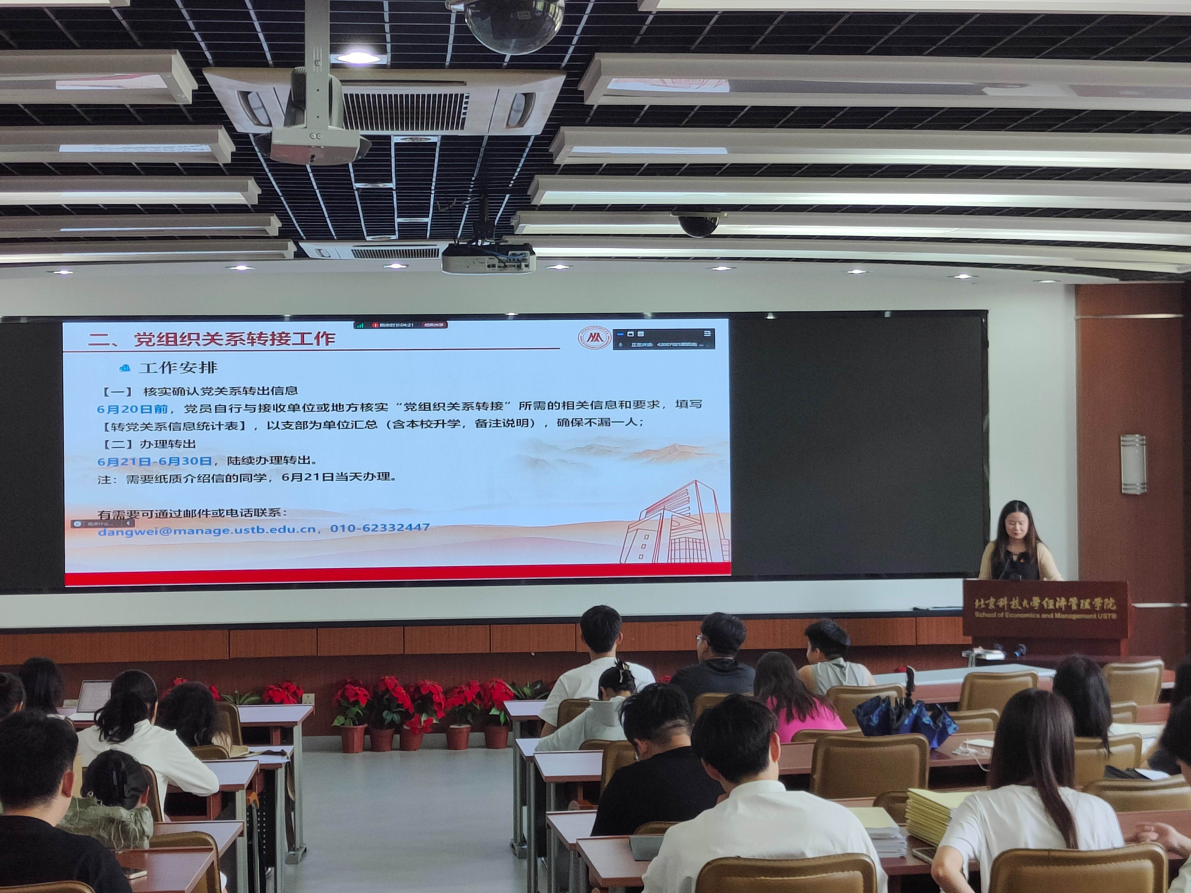 为顺利推进毕业生党组织关系转接,增强党员的政治觉悟和纪律意识,2024年6月12日下午15:30,beat365英国官方网站2024届毕业生党员纪律教育暨组织关系转接培训大会在经管楼313召开。本次大会由学院党委秘书张晓佳主讲,2024届全体毕业生党员参加。
