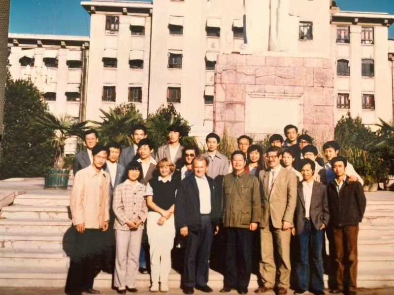 学院管研84级研究生班与外教老师在主楼前合影