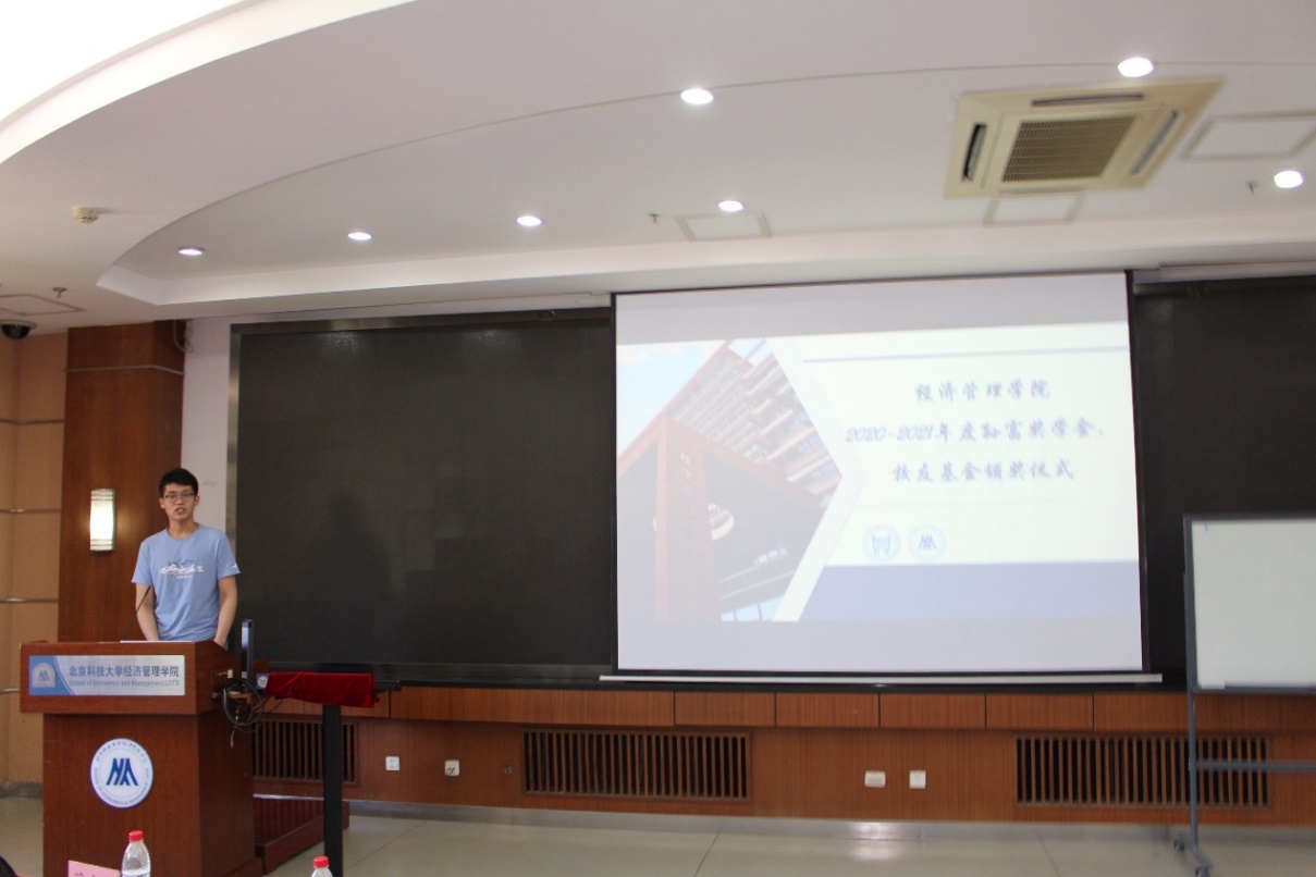 本届“榜样经管”获得者之一的杨一帆同学代表全体获奖学生发言,表达了对学院培养和校友关怀的衷心感谢,讲述了自己的成长历程并号召同学们不忘初心、艰苦奋斗、努力学习、全面发展、志存高远、乐于奉献。