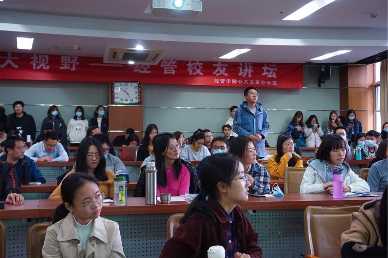讲座提问环节,现场听众就医药行业的带量采购、医药企业的社会责任以及岗位设置和发展等方面与校友进行了探讨。最后,武森书记对赵广耀校友的分享表示感谢,并表示管理大视野校友分享也会涉及到更多社会的热点领域,带来不同的行业前沿知识,欢迎同学们继续关注。
