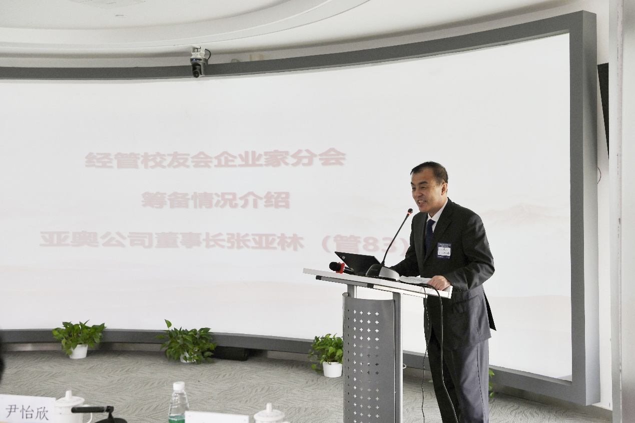 企业家分会筹备组组长、亚奥公司董事长张亚林作企业家分会前期筹备工作报告。他表示企业家分会隶属于经管学院校友会,今天企业家分会的正式成立既是崭新的征程,更是学院校友会连接和凝聚广大校友重要的桥梁和纽带,企业家分会组委会将紧密依靠和团结广大校友,积极工作、细致服务,努力将企业家分会建设成为温馨的校友之家。