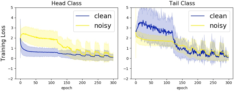 随着人工智能的发展,如何在噪声和长尾数据中训练模型在机器学习中引起了很多关注。然而,当前大多数方法都在理想化的状态下研究如何单独处理噪声或者长尾数据的问题,针对这一科学问题,贝博BB官网许廷发教授团队率先提出损失值曲线和元学习的方法同时解决噪声和长尾数据,通过大量的计算和实验观察发现,虽然从单个的权重无法区分噪声和尾部样本,但是在样本的整个训练过程生成的损失值曲线能够提供充足的信息区分这两种样本,如图1。
