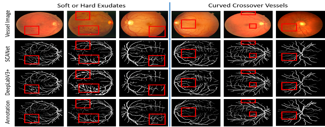 该分割模型不仅在静脉血管影像上取得出色的表现,也在其他多个具有挑战性的影像和皮肤病变影像数据集上都表现出明显的性能优势,通过在基准评价指标上的定性定量分析,证明了SCANet各组分结构的有效性。