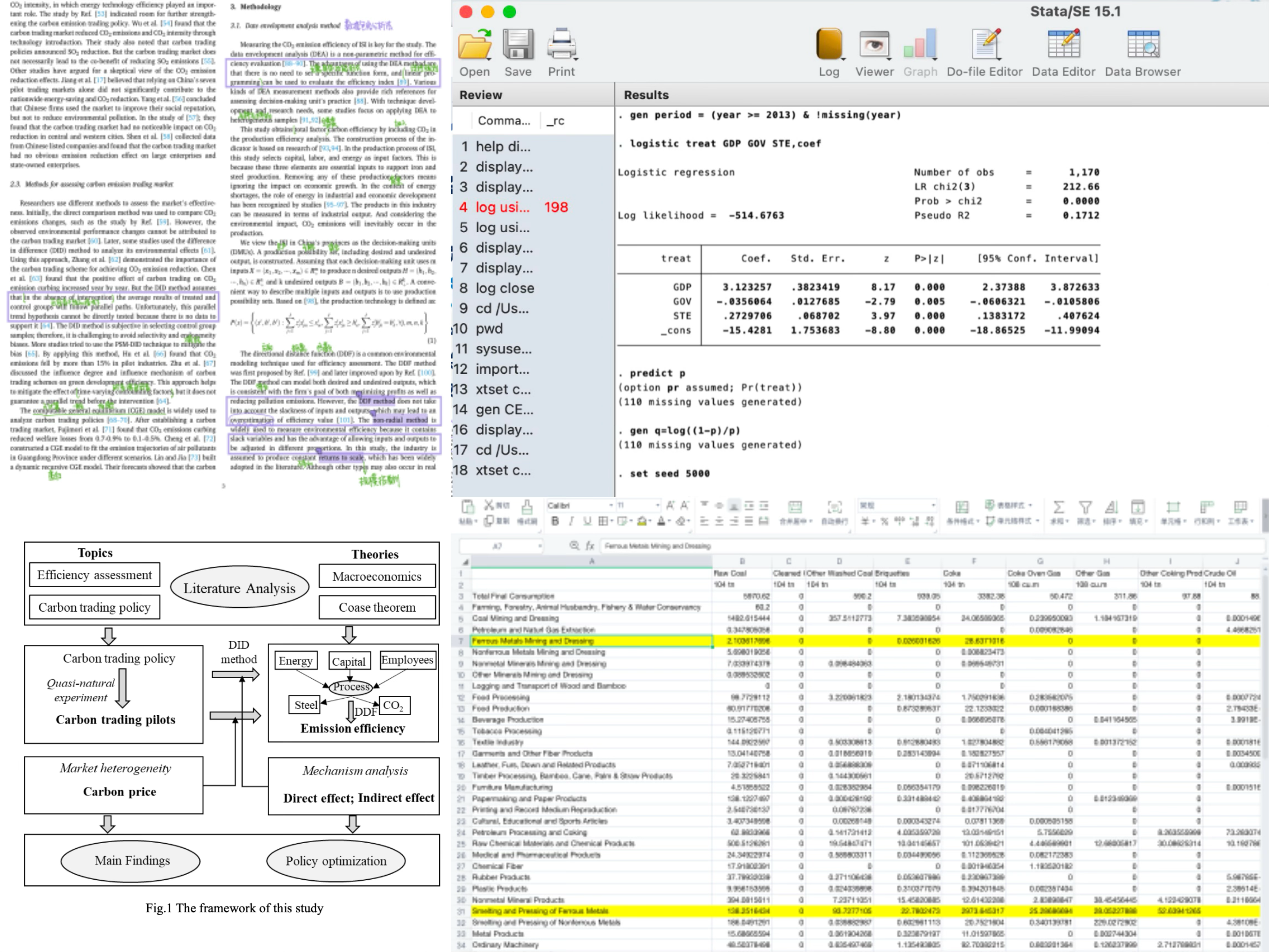 俞新宁在大二上学期便本着对科研的敬畏与憧憬向导师提出申请,希望加入科研工作。她曾参与过“智慧城市建设对建筑业生产率的影响”研究,在其中以三作的身份参与论文撰写。之后俞新宁又参与到了“碳交易对我国钢铁行业碳排放效率的影响机制”研究,在其中进行了数据收集和整理,应用Excel、Stata、MATLAB软件对数据进行处理、分析与可视化,运用非参数的生产前沿分析模型测算碳排放效率,并通过多时点双重差分模型验证了碳排放权交易政策对碳排放效率的提升作用。最终,在导师的指导下独立撰写全英论文,向SCI期刊进行投稿。俞新宁还以该课题为基础,担任团队负责人,带队参加了SRTP,获得校级立项。