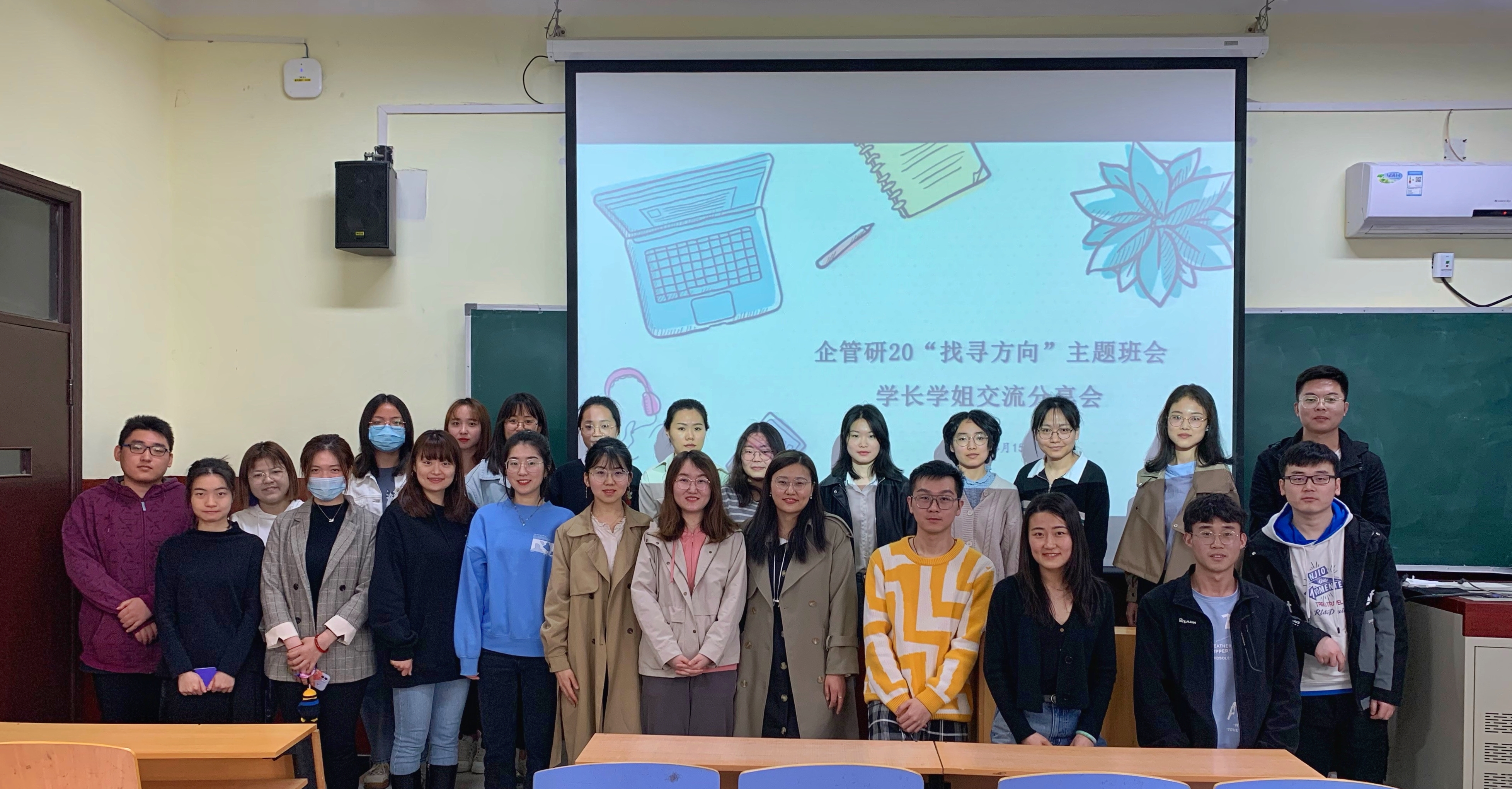 4月15上午10点,企管研20“找寻方向”主题班会暨学长学姐交流分享会于beat365英国官方网站管庄校区教学楼203举办,分享会由辅导员李响主持,企管专业的楚中柱、李柱等学长学姐与企管研20级全体学生参会。