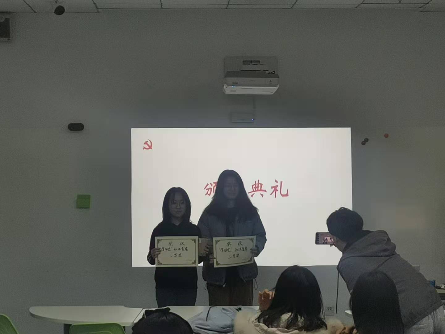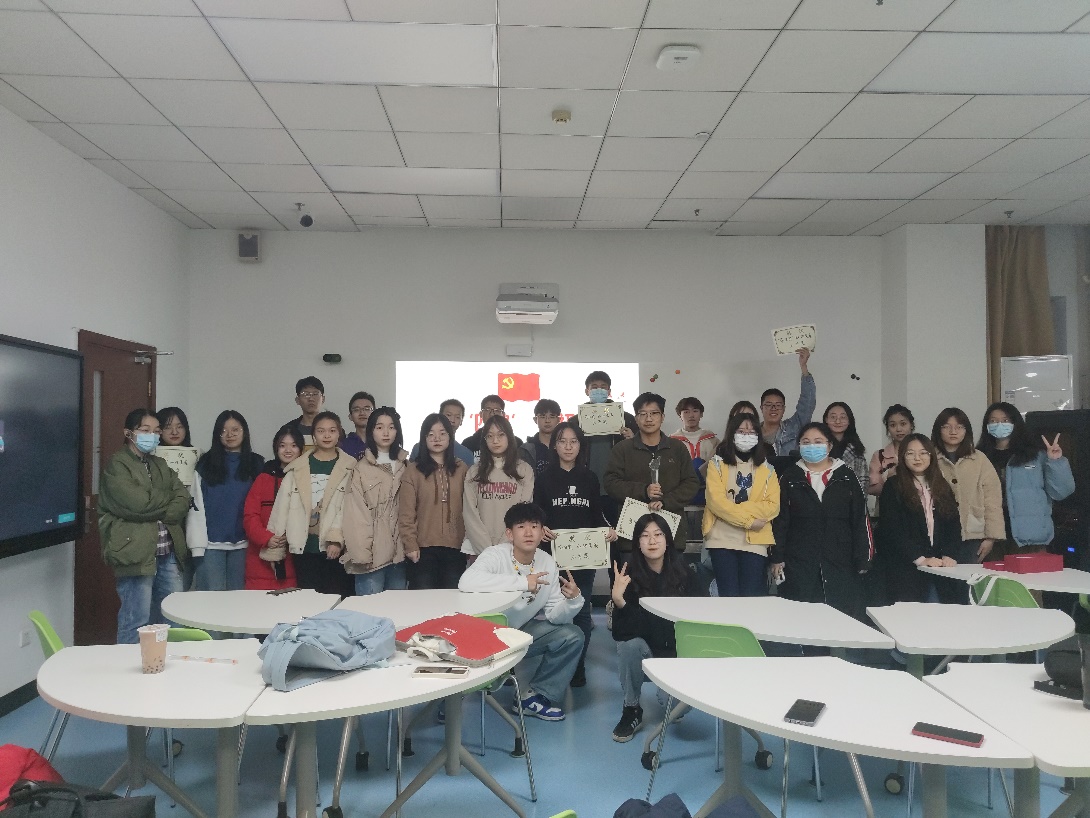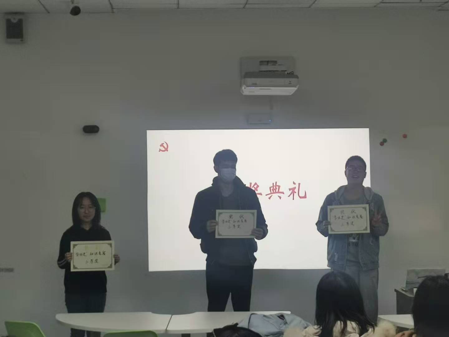 最后是第三项议程,学四史,守初心知识竞赛。这场比赛共分为两轮,每轮各20题,答对一题积一分,答错不扣分。两轮比赛结束后,按得分高低依次选出六名同学分获一等奖、二等奖、三等奖并颁发相应奖品。答题形式为举手抢答,由主持人选定第一个举手抢答的同学回答问题。回答错误则继续抢答,直至出现正确答案。在整个比赛过程中,每个同学都积极举手,展现着自己对党史的深刻理解,表达着自己对党史学习的热情。最后经过两轮的激烈角逐,一等奖由何谦同学获得,二等奖由蒙启迪同学和张玲同学获得,三等奖在经过了一场激烈的加时赛之后由丰硕同学,陈晓瑶同学和罗森华同学获得。在颁奖典礼上,奖状和奖杯由学习委员薛芝婷为获奖的同学颁发。至此,信管192班级的“学四史,守初心”主题团日到此结束。