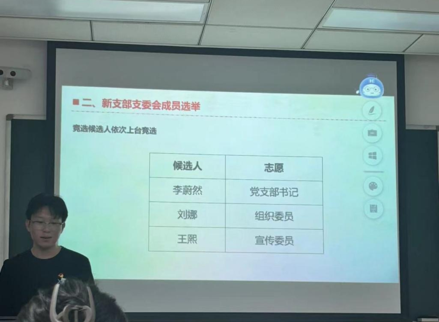 紧接着,大会进入到支部委员竞选环节。围绕党支部书记、宣传委员、组织委员三个关键岗位,三位候选人分别上台,以饱满的热情,阐述了各自的优势、工作思路及服务承诺。竞选过程中,各位候选人展现出了良好的精神风貌和较高的综合素质,赢得了在场同学的阵阵掌声。经过无记名投票,李蔚然、刘娜、王熙分别当选为党支部书记、组织委员、宣传委员。