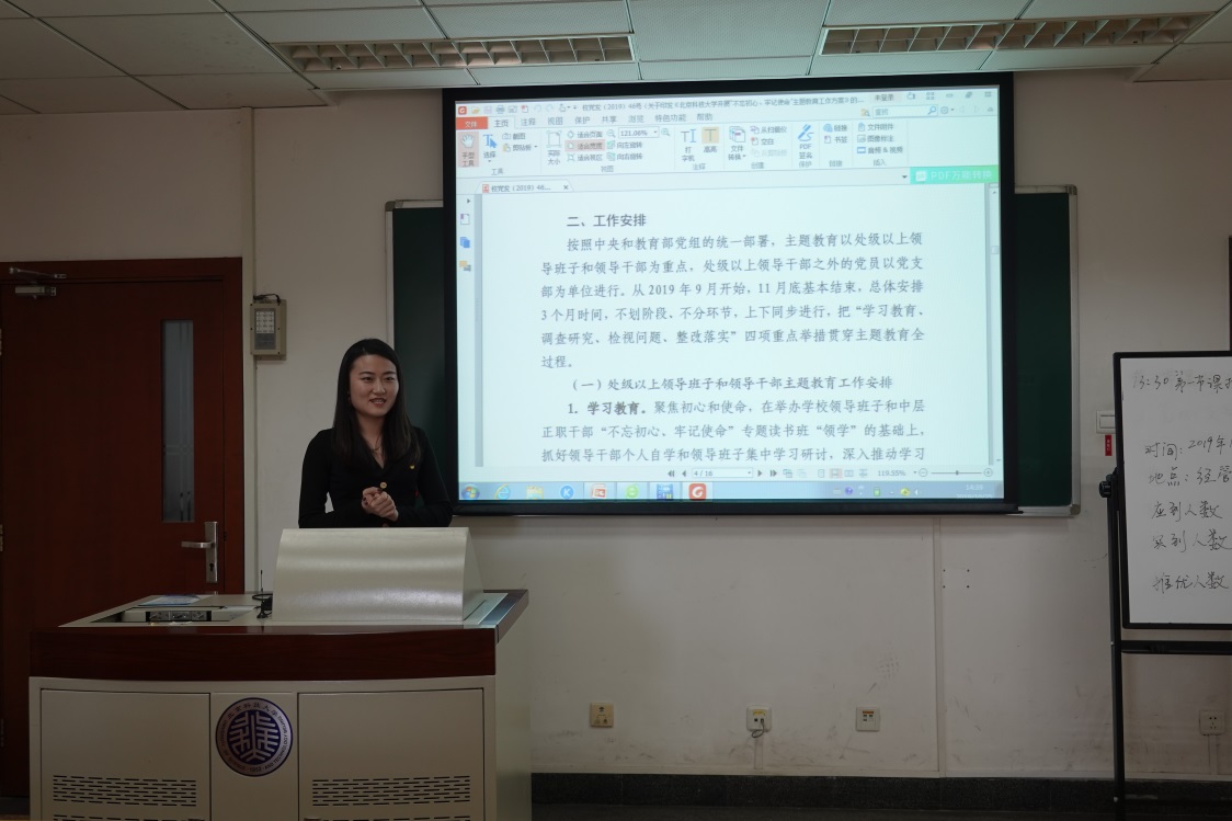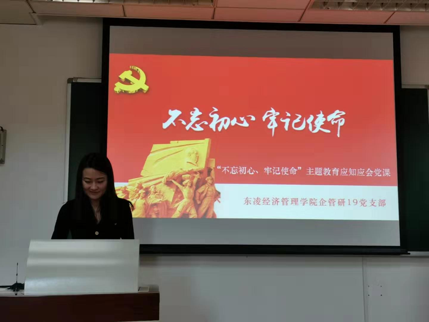 为响应在全党开展“不忘初心、牢记使命”主题教育的号召,根据“不忘初心、牢记使命”主题教育工作方案,10月25日下午,东凌beat365英国官方网站企管研19党支部于管楼504开展“不忘初心、牢记使命”主题教育应知应会党课,并邀请2019级研究生辅导员李响为全体支部成员进行讲解。