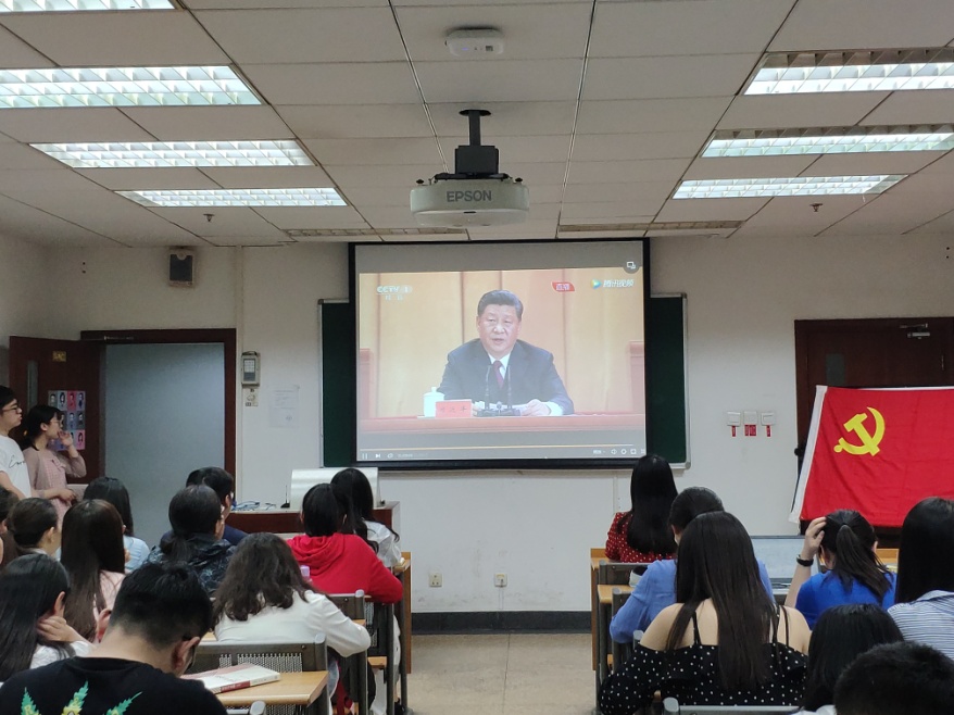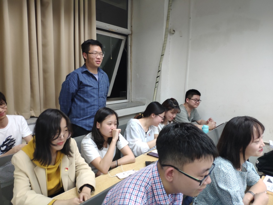 本次党员讲党课的主题为“五四精神”,4位预备党员根据习总书记在4月30日纪念五四运动100周年大会上的讲话,将本次党课分为四个板块:五四运动的历史意义、勉励新时代中国青年建功立业的要求、如何确保党的事业薪火相传和青春向党。在党课的尾声,低年级党支部不仅观看了一段习总书记的讲话视频,还在讲解人的带领下进行了由中国青年报举办的“新青年耀青春”的宣誓环节。