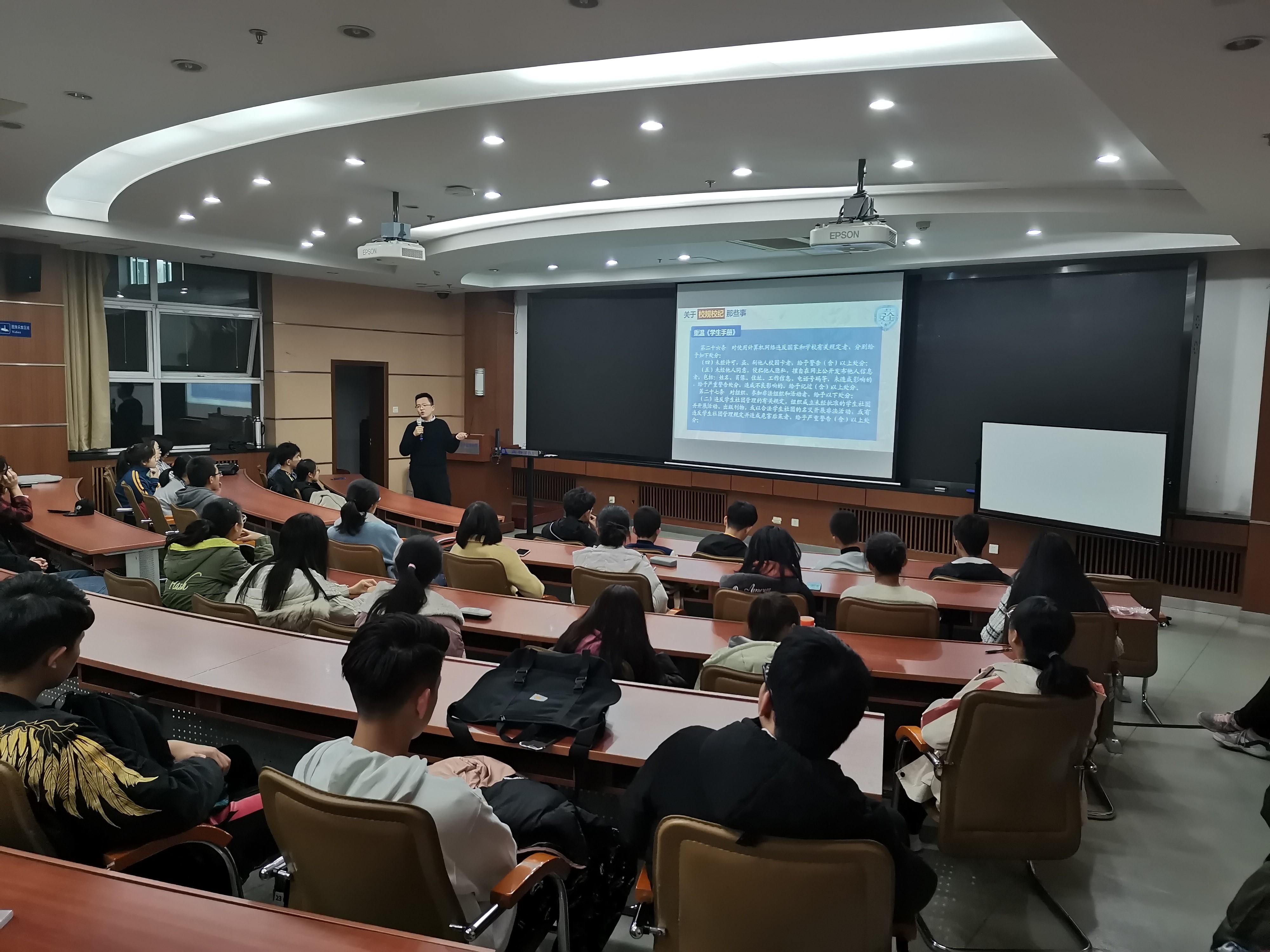 首先,就安全教育主题,张洪榛从发生在同学们身边的“小事”说起,分别在黑客,外卖,淘宝,涉毒,斗殴,性骚扰,盗刷饭卡等方面给同学们列举了一系列案例,深析其中的原因,让学生们认识到自己安全保护意识的淡薄。