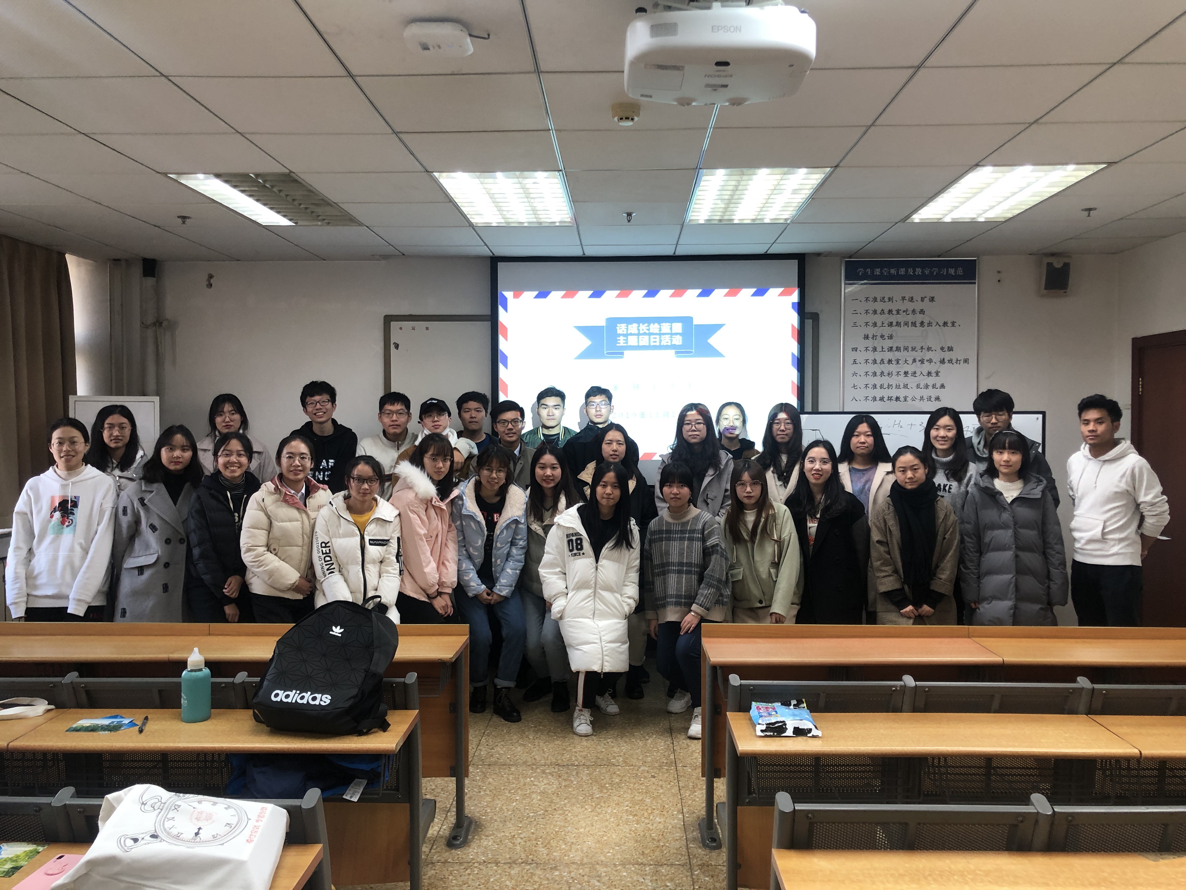 班会开始,班长魏子博给大家分发明信片。班会第一个部分是北科知多少,团支书分别设置了三个与北科有关的问题。随机抽取了六位同学,以PK接力的形式相互作答,互动中同学们发出阵阵笑声,充满了欢乐。