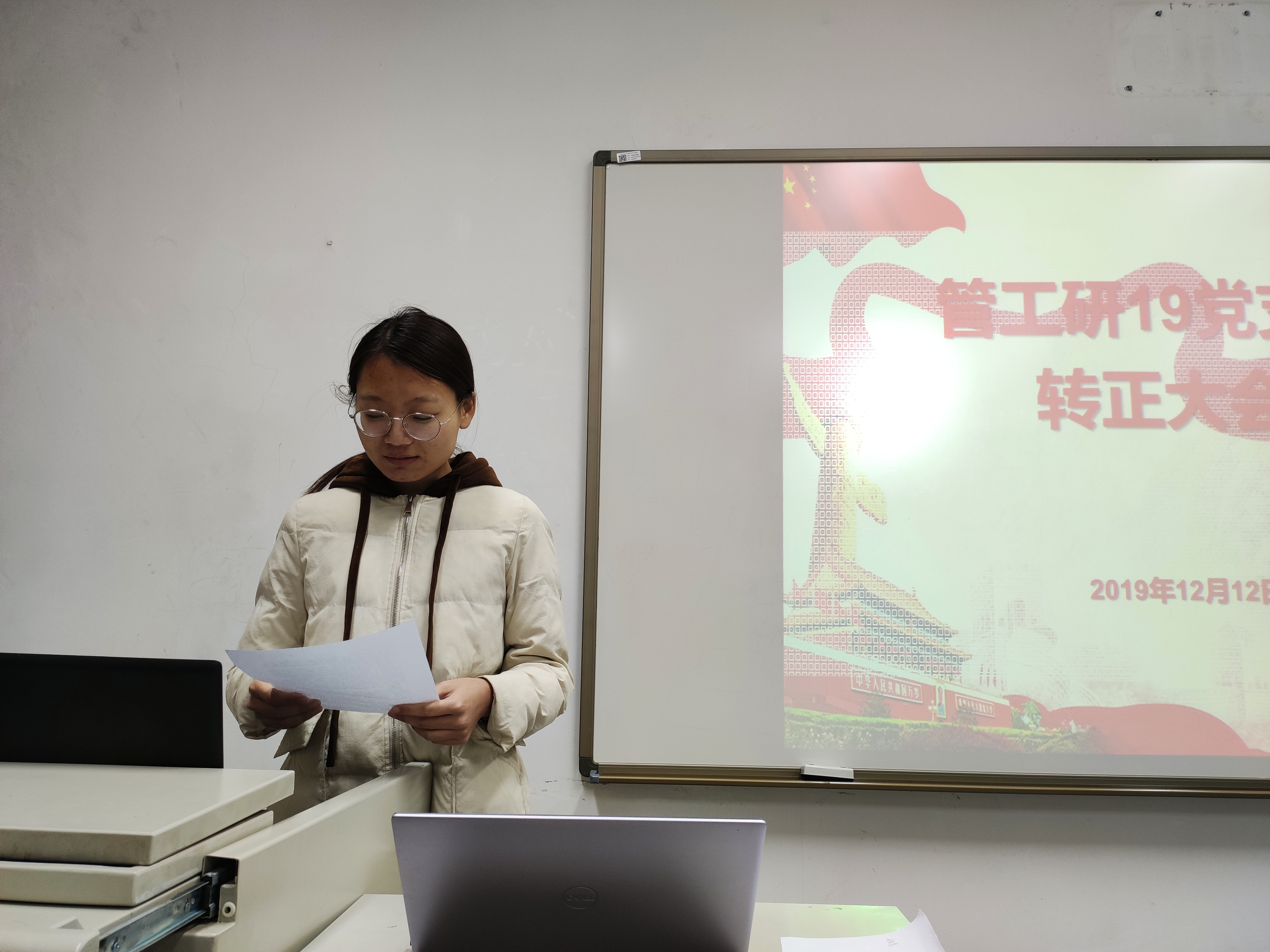 12月12日,东凌beat365英国官方网站管工研19级党支部在管楼310顺利召开了中共预备党员转正大会暨“不忘初心、牢记使命”主题观影活动,党支部书记尹香婷主持本次活动。