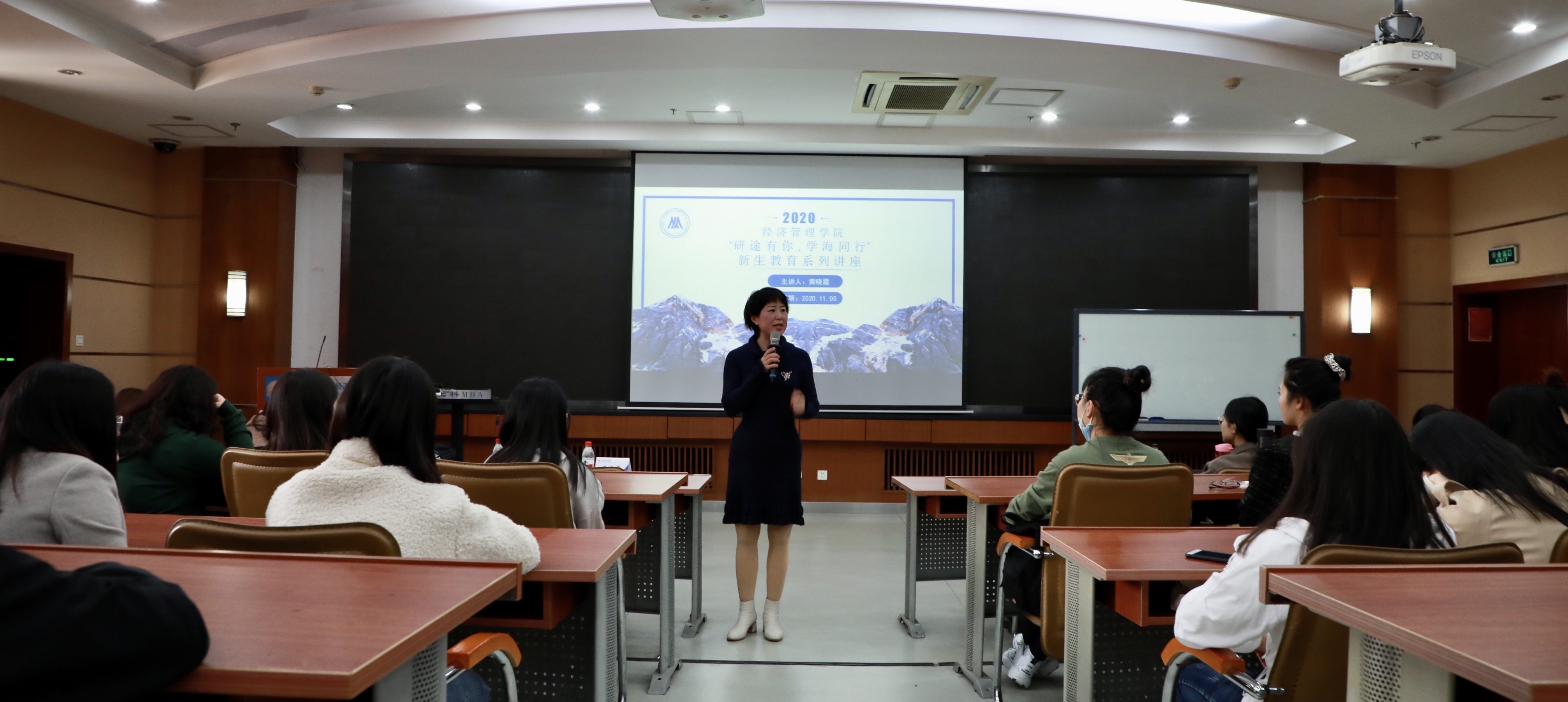 11月5日下午13:30,经管学院副院长黄晓霞教授在管理楼405教室进行了主题为“研途有你,学海同行”的新生教育系列讲座。beat365英国官方网站2020级全体研究生、辅导员李响共同聆听了讲座。