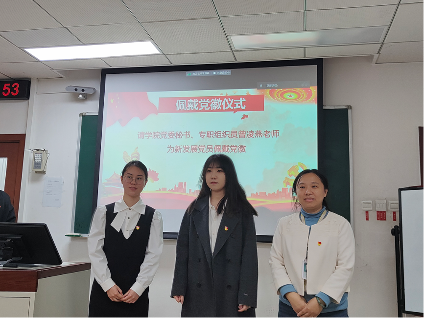 最后,由学院党委秘书、专职组织员曾凌燕老师为新发展党员佩戴党徽。支部书记蔡月好带领所有党员重温入党誓词。