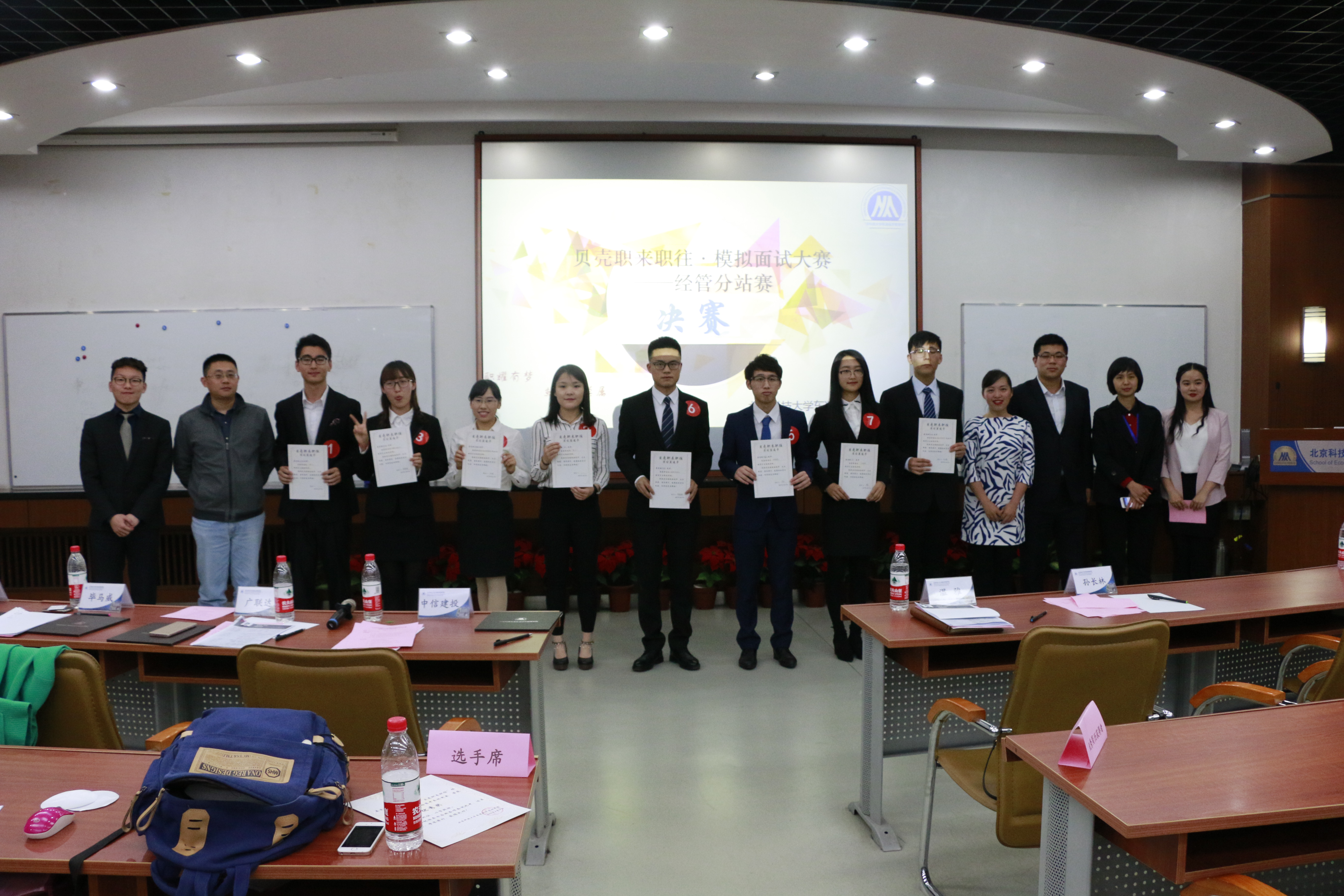 第九届模拟求职大赛经管分站赛的决赛于4月18日晚在经管楼313举行。担任本次比赛的企业评委有中信建投北京三环东路证券营业部总经理常文涛先生,广联达科技股份有限公司招聘经理王炯女士,毕马威华振会计师事务所校招负责人张景昱先生以及招商银行北京分行信用卡部主任黄灏鹏先生。学校就业指导中心主任孙长林和东凌beat365英国官方网站党委副书记温雅出席活动,决赛由东凌beat365英国官方网站就业专任教师张晓佳主持。