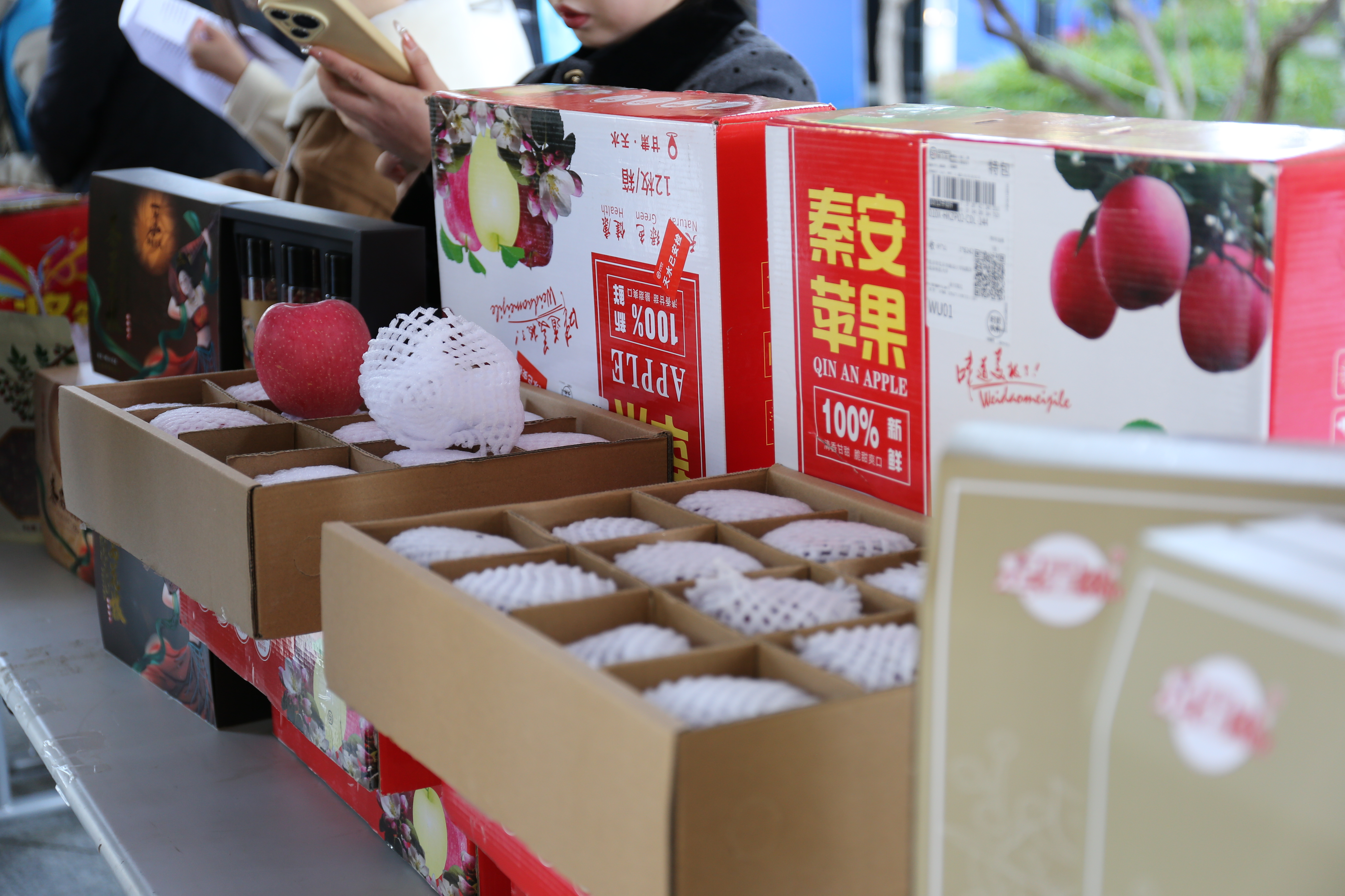 现场蜂蜜的甜香、花椒的麻醇交织,泡脚粉、菊花、应季水果等秦安特色农产品整齐陈列,以“一产品一小队”模式由队员与农户携手推介,沉浸式助力乡村振兴。