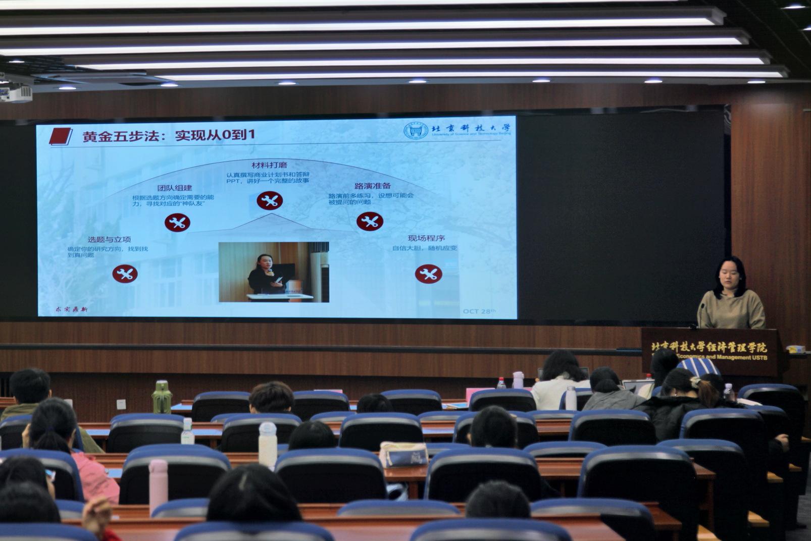 刘芳羽围绕资源获取与PPT美化进行分享,建议同学们建立常规信息获取习惯,充分利用校内外平台资源,系统把握政策支持。她提出PPT美化应遵循风格统一、视觉化、结构化与对比强调的原则,帮助同学们提升参赛材料的视觉效果与专业水平,为项目突围奠定坚实基础。