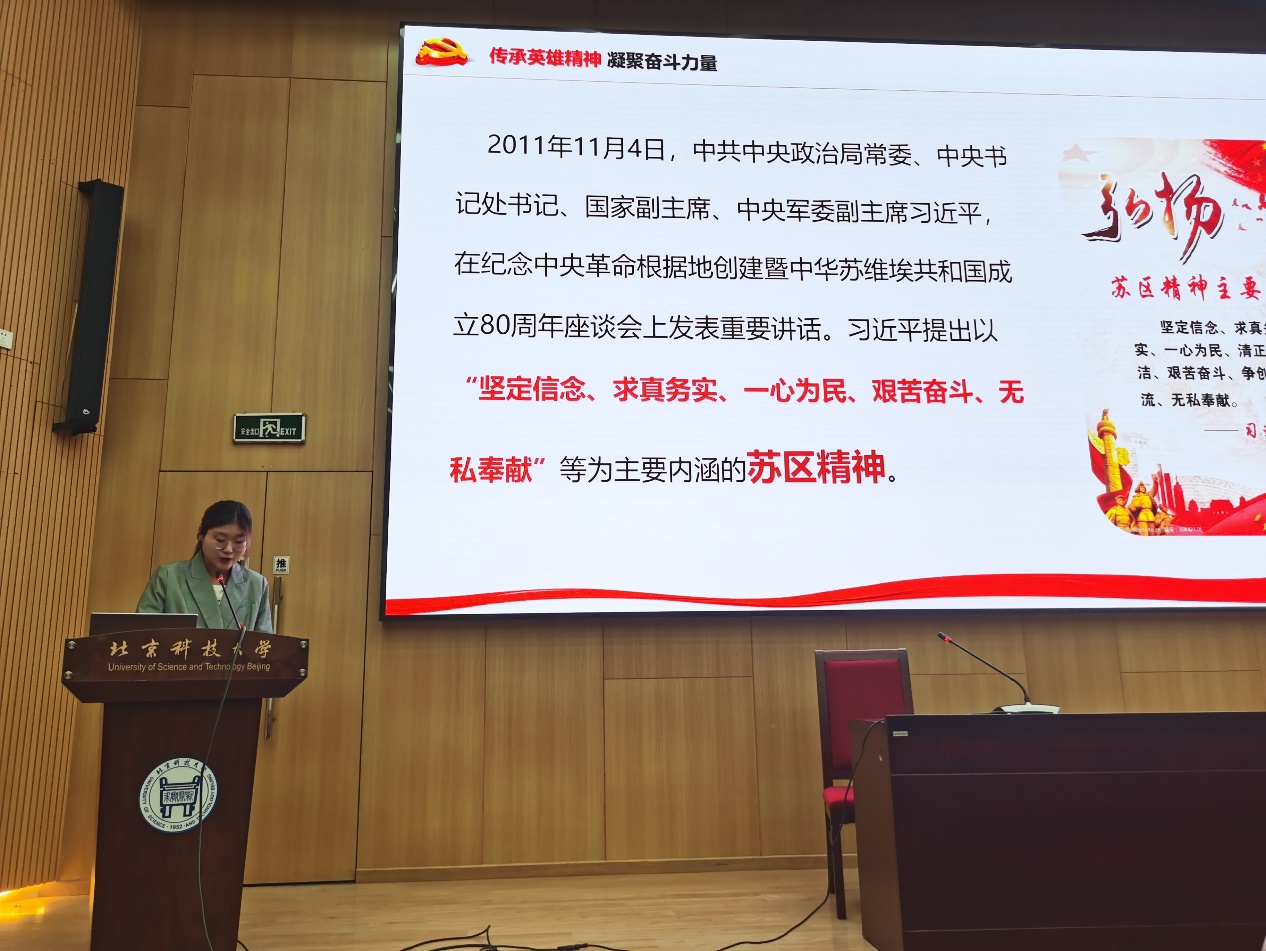 接着,学院党史宣讲团于越、李钰葳进行主题报告。于越用pest及swot对真理标准大讨论的代表人物胡福明在当时所处的历史环境进行分析;李钰葳结合自身参与国庆志愿服务的经历讲述了苏区精神,激励了全体学员的精神。