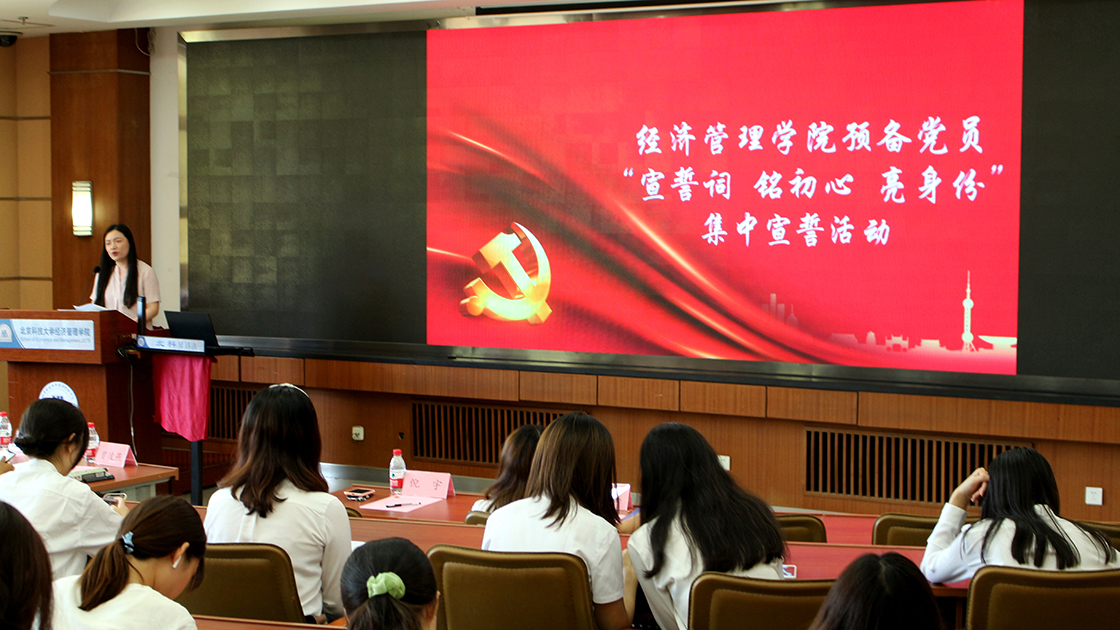 首先张洪榛带领本科18级预备党员进行入党宣誓,“我志愿加入中国共产党......”同学们一声声铿锵有力,响亮的入党誓词回响在经管楼405教室。随后,孙鑫、胡鹏凯为预备党员代表佩戴党徽,当代表着中国共产党的党徽被庄严的戴上,意味着已是预备党员的同学们将以更认真踏实的态度践行党的实践精神,为成为一名正式党员做出更多努力。