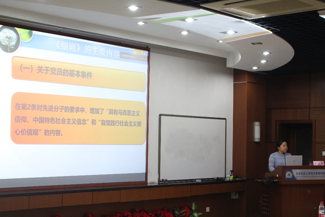 曾凌燕先简要阐述党员发展工作的指导原则,强调党员要始终把政治标准放在首位,要坚持信念坚定,对党忠诚,为民服务,严守纪律,并为同学们解读《细则》的主要内容。
