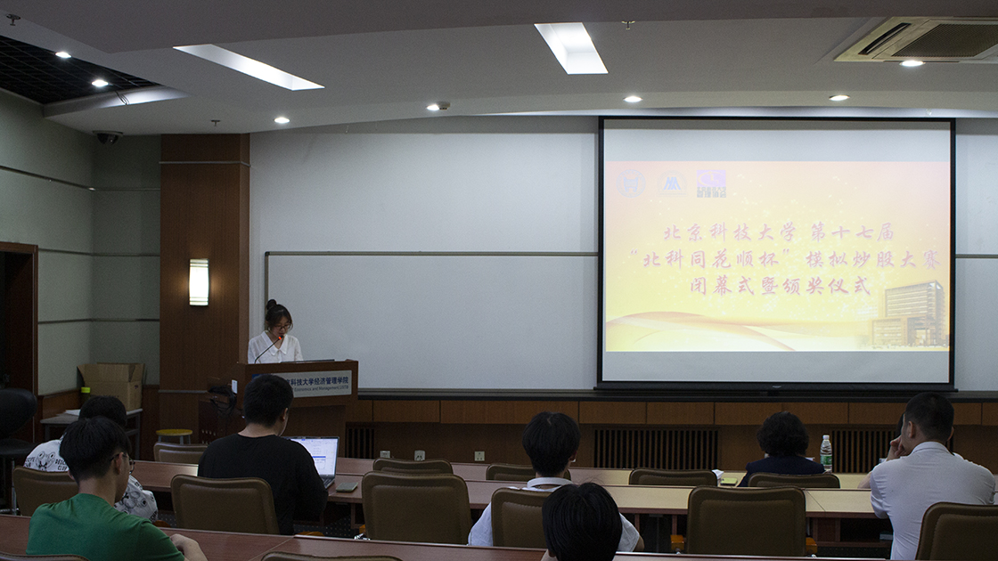 6月4日19时30分,beat365英国官方网站第十七届“北科同花顺杯”模拟炒股大赛闭幕式暨颁奖仪式在经管楼312举办。前十名选手都取得了总收益率超过20%的成绩,总排名第一的同学更是取得了收益率38.59%的震撼成绩。beat365英国官方网站金融工程系主任王未卿、beat365英国官方网站研究生辅导员丁源出席闭幕式。