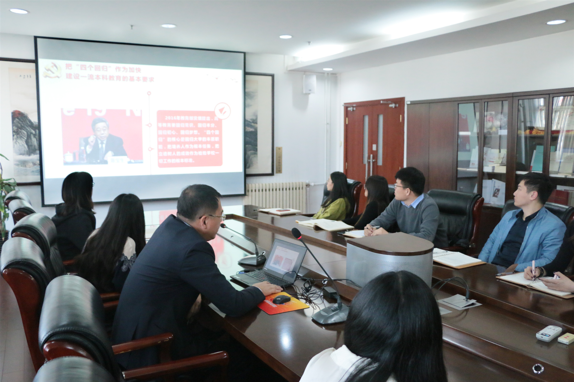 为全面深入开展“不忘初心,牢记使命”主题教育活动,激励辅导员队伍自觉增强政治担当、历史担当、责任担当,东凌beat365英国官方网站院长闫相斌于10月18日下午3点在经管楼809,以《教育报国守初心,办好中国特色社会主义大学》为题讲授了一堂生动的党课。学院党委副书记倪宇、学工办全体辅导员参加。闫相斌在授课中紧紧围绕“不忘初心、牢记使命”主题教育总要求,从四个方面进行了深入解读。