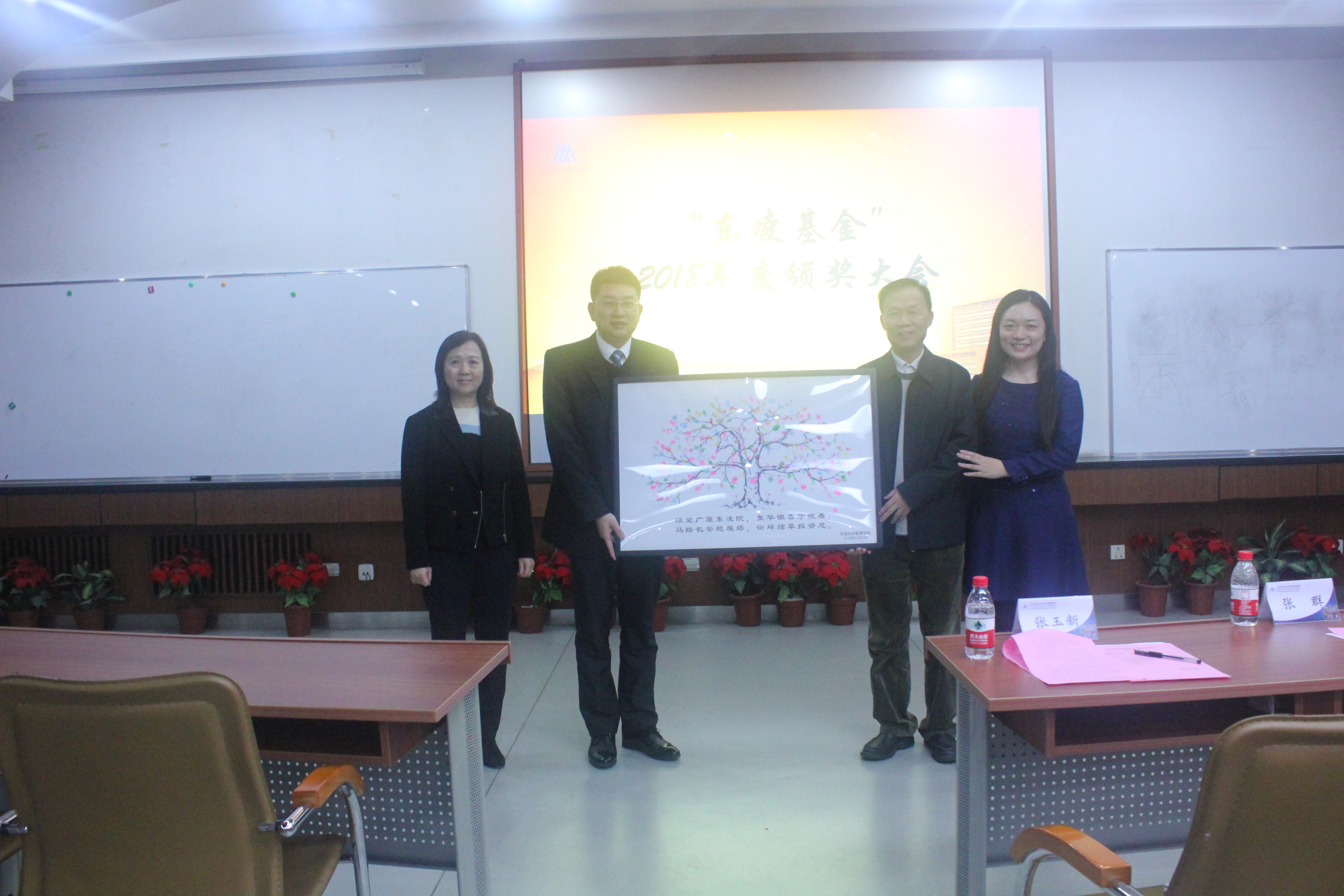 11月29日下午,东凌beat365英国官方网站“东凌基金”2018年度奖助学金颁奖大会在经管楼313举行。东凌集团副总裁张玉新先生、“东凌基金”管理委员会秘书长张群教授、东凌beat365英国官方网站党委书记戴淑芬教授出席本次活动。大会由东凌beat365英国官方网站党委副书记倪宇主持。