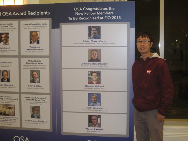 在最初的一年中,他全心考博,并且在王涌天教授的课题组从事真三维显示技术研究。他利用自己硬件研发的特长协助课题组完成科研项目,另一方面也在逐步了解、掌握国际三维显示的研究现状。在此期间,他不仅学习、重温多门光学基础课程,参加各种学术活动,并且逐步培养自己检索、复现、撰写、发表最新科研成果的素质与能力。博士在读期间,他几乎每天都是工作到最晚离开实验室。虽然已经建立家庭,他一直坚持每周只在周末回家一天,其余时间都在实验室进行理论学习与光学实验。仅仅用了半年多的时间,他就掌握了国际全息三维显示研究的热点与难点,并初步建立了多视几何理论与计算全息相结合的快速全息图计算理论。优异的学习成绩、出色的科研成果使他得到留学基金委的资助,支持他在美国弗吉尼亚理工大学电气与计算机工程系联合培养两年,进入本领域的著名国际光学专家Ting-Chung Poon教授的课题组学习交流。