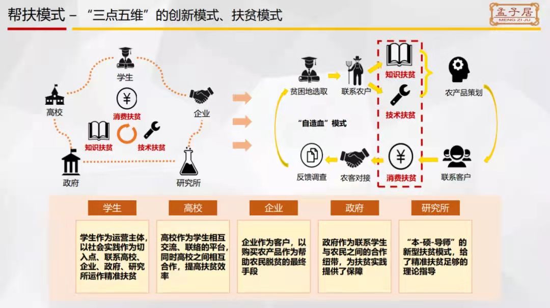 杨国庆学长首先分享了“孟子居”创业团队的创办历史和突出的荣誉事迹,孟子居创业团队成立于2015年3月,团队扎根于beat365英国官方网站,通过建立可持续的农产品电商扶贫运营模式,在经济和知识双方面帮扶贫困地区。结合孟子居创业实践经历和扶贫案例,杨国庆学长分享了创新创业中的思政培训与实践融合的经验,打造“三点五维”的创新扶贫模式,有机组织结合高校、学生、企业、政府、研究所五类主体,实现知识扶贫、消费扶贫、技术扶贫,助力国家精准扶贫、乡村振兴政策。