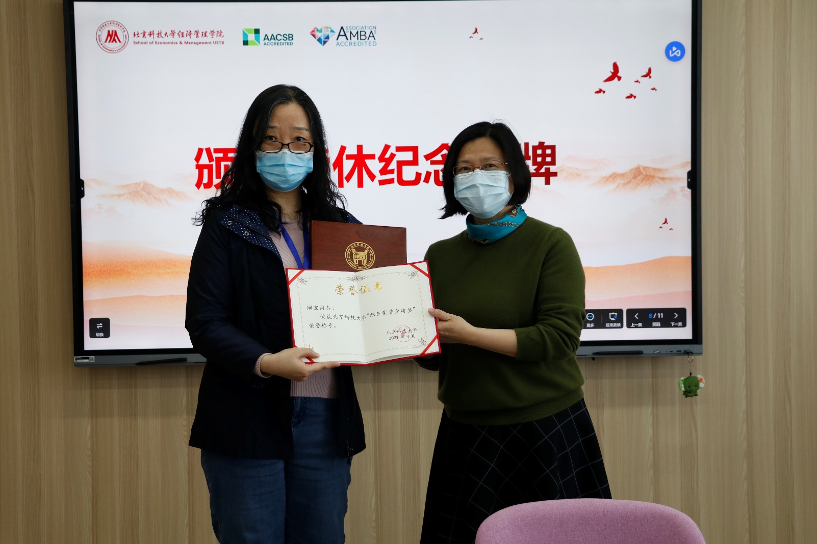 仪式最后,武森书记代表学校向阚宏老师颁发了三十年工龄纪念牌和荣誉证书,范小华副院长代表学院向阚宏老师赠送了学院专门定制的荣休纪念牌,应用经济系系主任冯梅老师作为教师代表向阚宏老师献上了鲜花,祝愿阚宏老师退休生活一切顺意,幸福美满。荣休欢送仪式在温馨和祥和的气氛中落下帷幕。