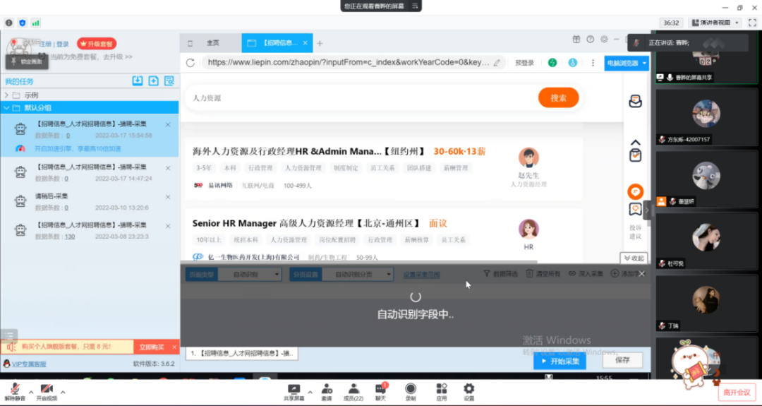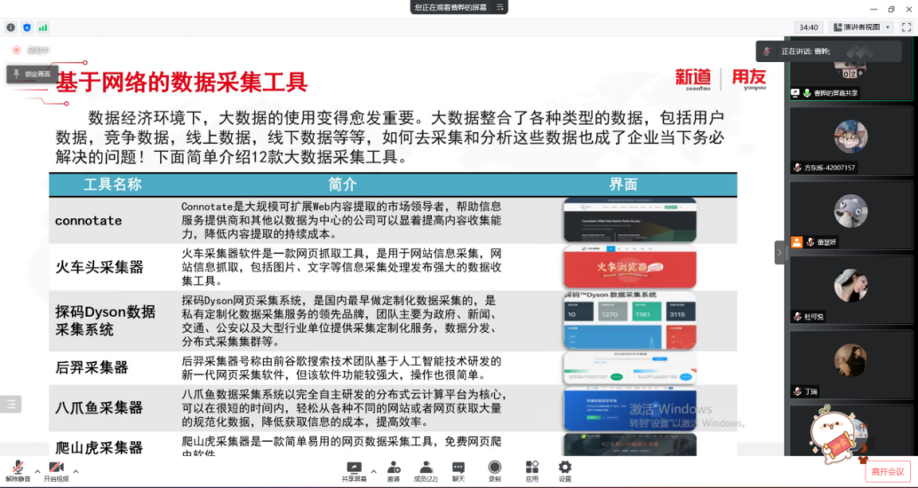 2022年3月17日,beat365英国官方网站工商管理系“人力资源大数据实践项目”开展了第二次课程教学。按照疫情防控期间相关要求,本次授课依旧采取腾讯会议的方式进行,有幸邀请到新道科技股份有限公司高级讲师曹晔进行讲授。同学们对曹老师的上课方式已经有所熟悉,和着老师的讲课节奏,课程进度十分顺利。曹老师对同学们的大数据基础进行了摸底测试,紧接着便开始了“干货”的教学——数据清洗与数据挖掘。曹老师从大数据来源、数据结构类型和一般数据收集方法与途径这三个方面进行了讲解,并带领同学们进行了数据爬取的实操。
