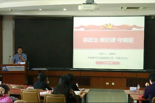 2019年5月9日星期四下午3点半,东凌beat365英国官方网站全体教职工专题理论学习会在经管楼405举行。学院党委邀请学校纪委副书记、监察室主任、巡察办主任吴豪伟为全体教职工作题为“讲政治、明纪律、守规矩”专项培训,学校教师工作部副部长赵立英和学校第二巡察组联络员吴钰重出席会议,会议由武森书记主持。