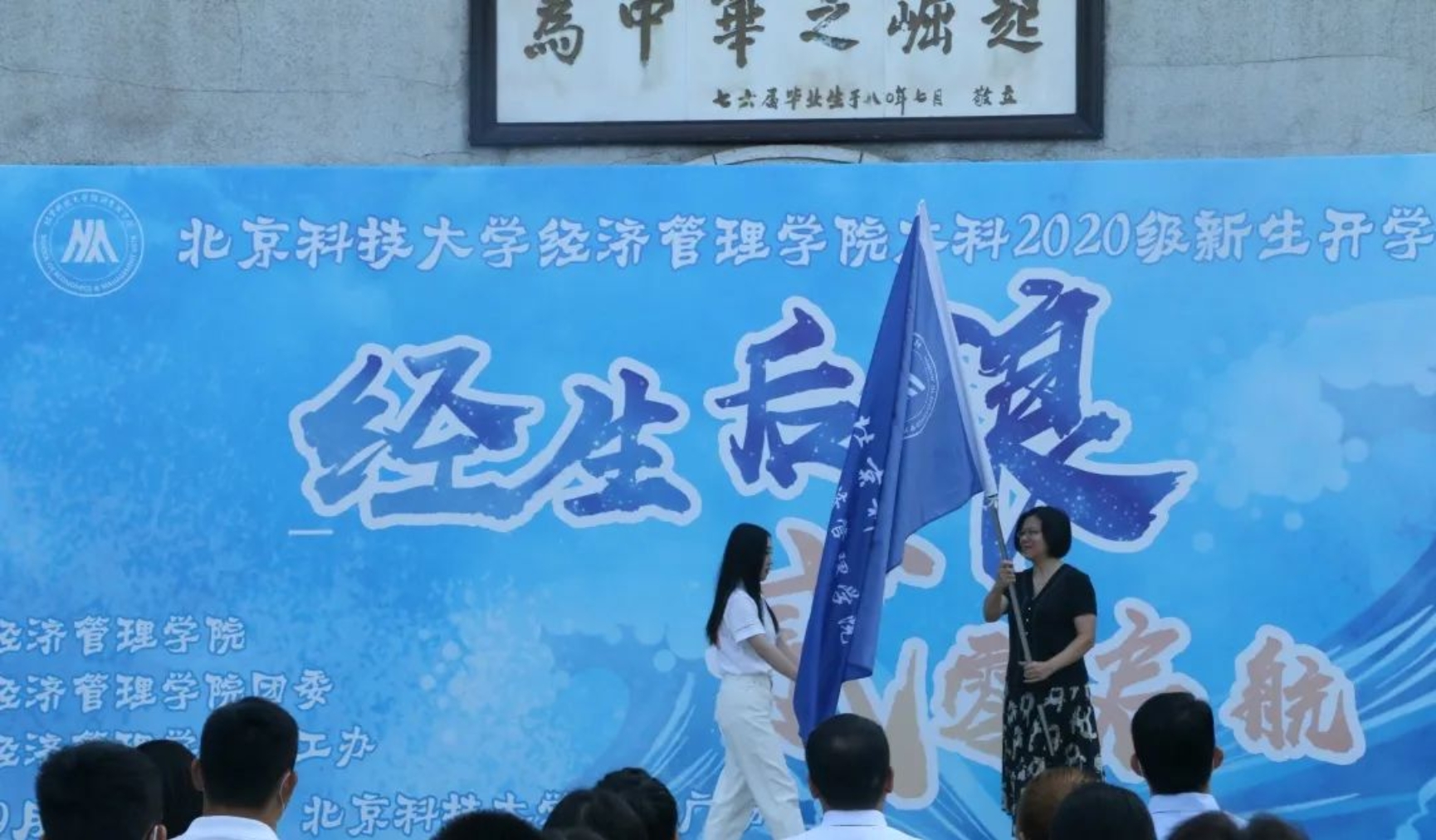发言过后,党委书记武森教授为新生代表授院旗。接过院旗,就正式成为一名经管人,寓示着希望同学们发扬“德性实践,学道创新”的院训精神,勇担新时代重任,在追梦路上奋力拼搏,将学院“拓荒牛”的精神代代相传。