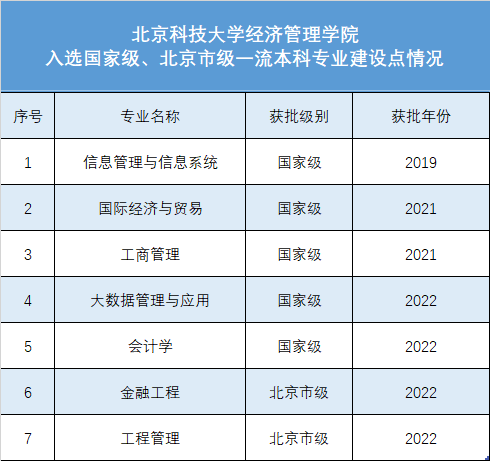 日前,教育部印发《教育部办公厅关于公布2021年度国家级和省级一流本科专业建设点名单的通知》(教高厅函﹝2022﹞14号),正式公布2021年度一流本科专业建设“双万计划”建设点名单。beat365英国官方网站大数据管理与应用、会计学专业获批2021年度国家级一流本科专业建设点,金融工程、工程管理专业获批2021年度北京市级一流本科专业建设点。至此,学院7个本科专业全部获批一流本科专业建设点,其中5个专业获批国家级一流本科专业建设点、2个专业获批北京市级一流本科专业建设点。