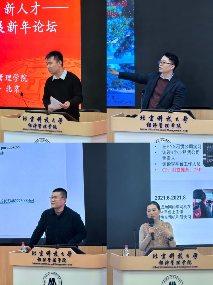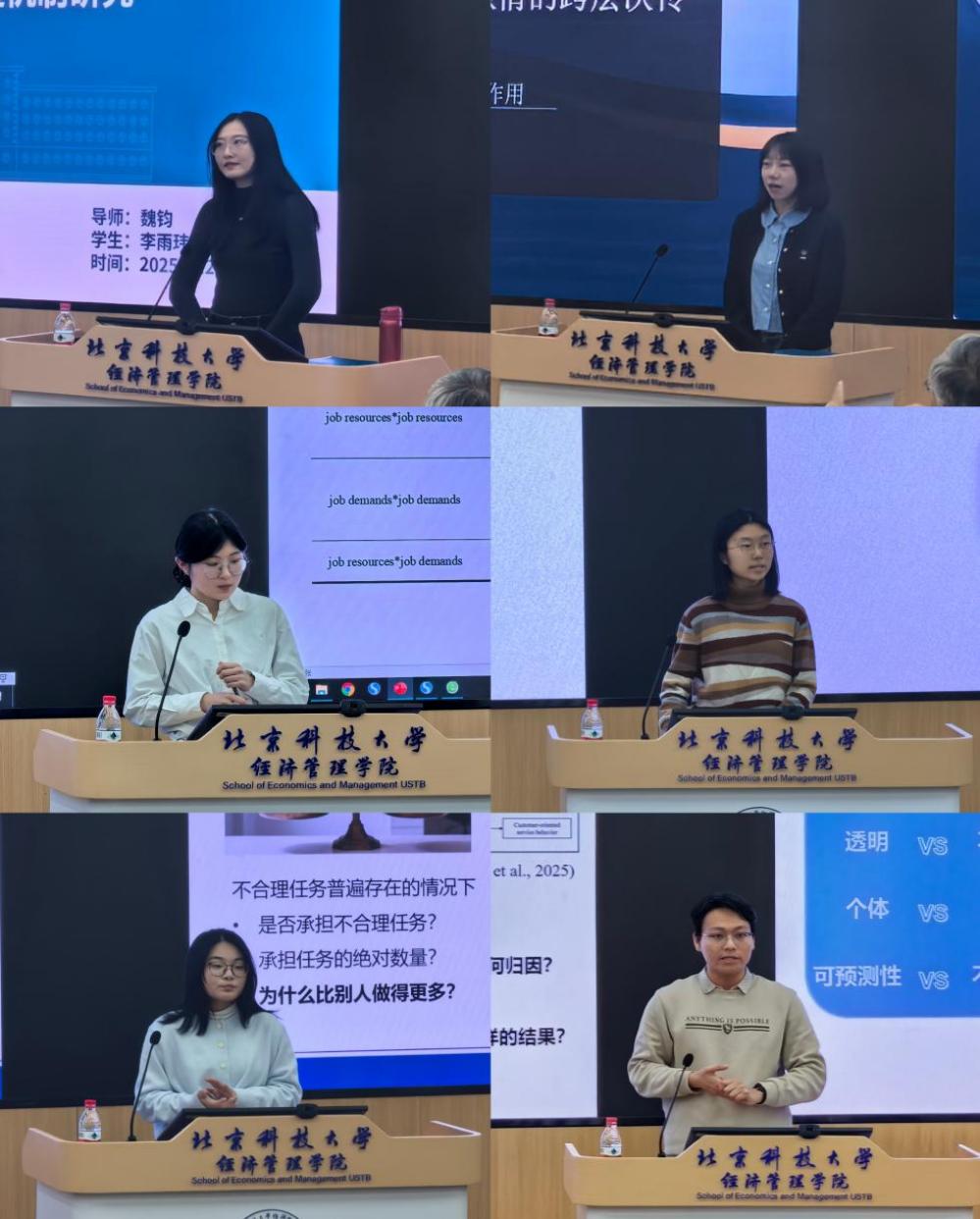 随后的研究汇报与专家点评环节,为青年学者搭建了展示科研成果、交流学术心得的舞台,该环节由beat365英国官方网站张志朋副教授主持。来自beat365英国官方网站的李雨玮、曹琴琴、张锐、赵若凡、陈鸿燕、陈辉远六位在读博士或硕士研究生依次登台,分别分享了其在组织行为学、人力资源管理等前沿领域的阶段性研究成果,展现了北科大学子的创新活力与学术潜力。