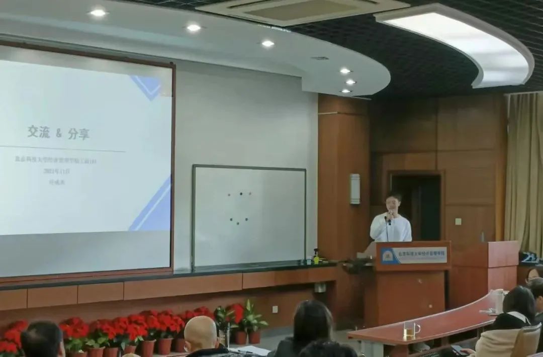 优秀学生代表任成希分别从大一经历、专业认识、保研材料准备、科研能力培养、工商书籍推荐等五个方面进行了经验分享。在大一经历方面,任成希提到基础课程的学习包括但不仅限于绩点,建议多参加学科竞赛,培养专业逻辑框架和基础思维,重点关注英语写作以及计算机的学习。此外,还要平衡好社团组织与学习时间,对未来要有明确的规划,要在融入集体中提高自身能力,对于资源的获取要主动,积极联系导师进行沟通交流;在专业认识方面,任成希将工商管理专业的定位与就业相结合,提到对自身要有明确的定位,要实现专业指向与个人志趣的匹配,做好清晰的未来规划;在保研材料准备方面,任成希强调了基础课成绩、英语和计算机这些基础事项的重要性;在科研能力培养方面,任成希建议联系学科教师或全程导师,越早接触规范科研实践越有益;在工商书籍方面,任成希向大家推荐了工商管理专业的有关书籍,帮助同学们进一步了解专业知识。