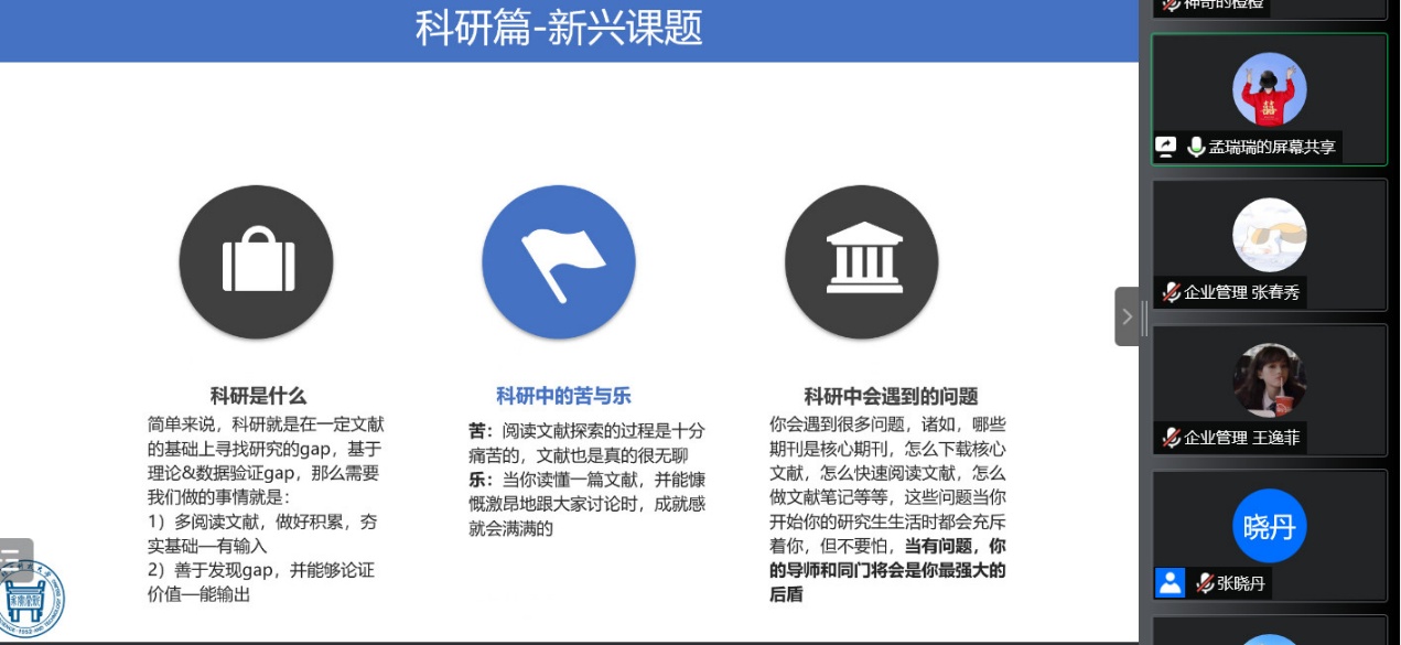 与在校学长交流环节,经管学院的优秀学长们,用自己的亲身经历,与营员们分享研究生生活的苦与乐,现场气氛热情活泼,笑声不断。