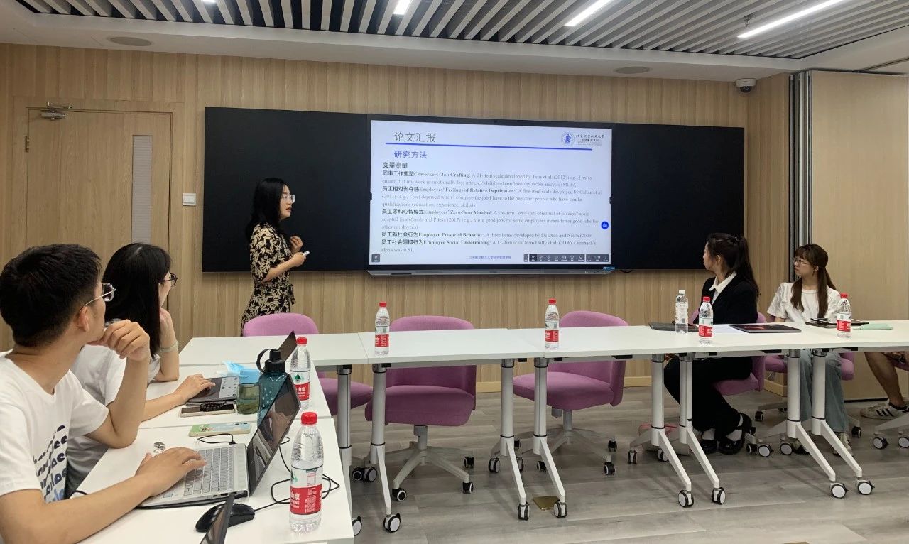随后,活动进入到青年学者分享环节。北京航空航天大学beat365英国官方网站副教授董雅楠报告了以第一作者身份发表在FT50期刊《Journal of Business Ethics》上的文章《Why is Crafting the Job Associated with Less Prosocial Reactions and More Social Undermining? The Role of Feelings of Relative Deprivation and Zero-Sum Mindset》。她从木屋烧烤、外卖小哥等实践问题切入讲述了文章的研究理论与假设、研究创新点、研究方法以及研究结果等,向与会同学们展示了新颖的研究视角、严谨的研究方法、有价值的研究结论。