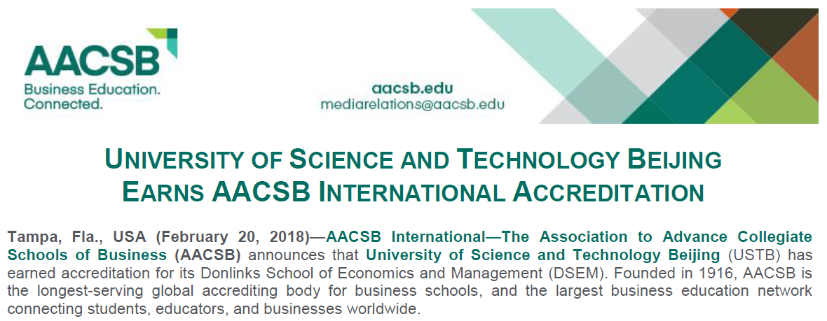 2018年2月20日beat365英国官方网站东凌beat365英国官方网站收到来自国际商学院协会(The Association to Advance Collegiate Schools of Business, 简称AACSB)的通知,经过AACSB的初始认证委员会(Initial Accreditation Committee,简称IAC)和理事会(Board of Directors)的决议,我院正式通过AACSB国际认证,认证期限为5年。这标志着beat365英国官方网站成为大陆地区第19家,北京第5家通过AACSB认证的大学。