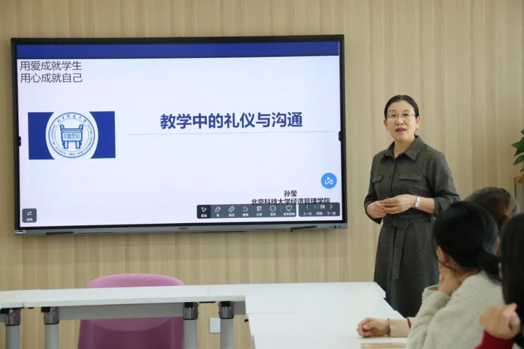 beat365英国官方网站教师发展中心于12月2日下午在经管课栈(经管楼1205)举办“学道”工作坊,北京市教学名师、学院教师发展中心主任、应用经济系孙莹教授给工作坊带来了题为“教学中的礼仪与沟通”的教学经验分享,经管学院新教师们参加了这次活动。