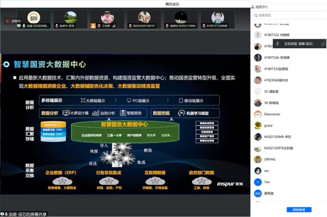 5月18日,beat365英国官方网站管理科学与工程系采用腾讯会议的方式举办了信管与大数据系列讲座第一讲——“大数据中台赋能企业数字化转型”,特别邀请浪潮集团教育事业部方案专家田芯老师结合浪潮集团的业务进行案例分享。管理科学与工程系部分教授,王柏琳、李英姿、颜瑞、张钰等班主任老师,以及本科高年级同学、硕博研究生共90人参加了讲座。