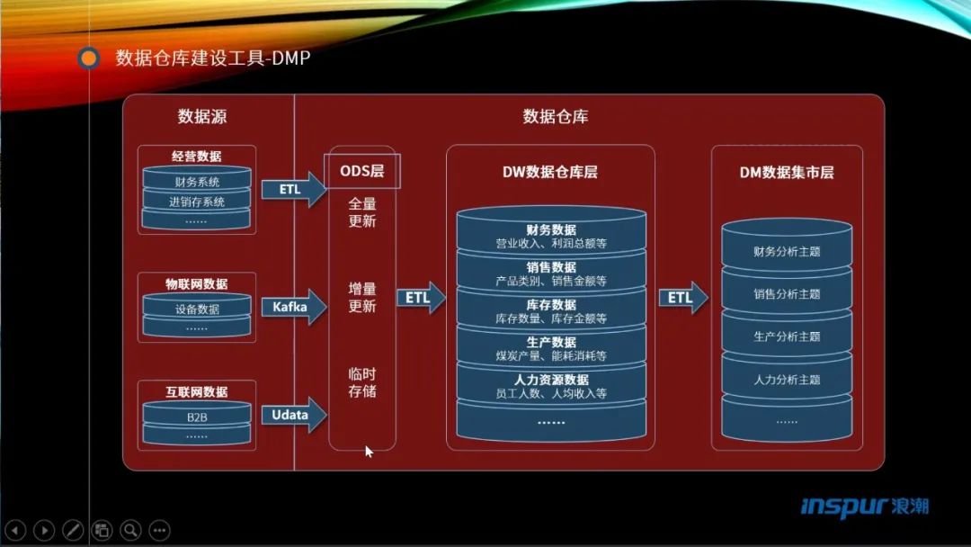 然后介绍了浪潮DMP数据中台总体架构的组成,如数据采集、数据治理、数据储存、数据分析、数据可视化展示五部分。对数据共享、数据集市、数据仓库、操作数据等逐一进行了具体讲解。数据仓库建设工具丰富,中台数据平台提供一站式服务,可视化建模的全流程服务,支持主流的深度学习框架,内置丰富的算法组件,拖拉拽即可完成各类业务建模,让数据挖掘变得容易操作。