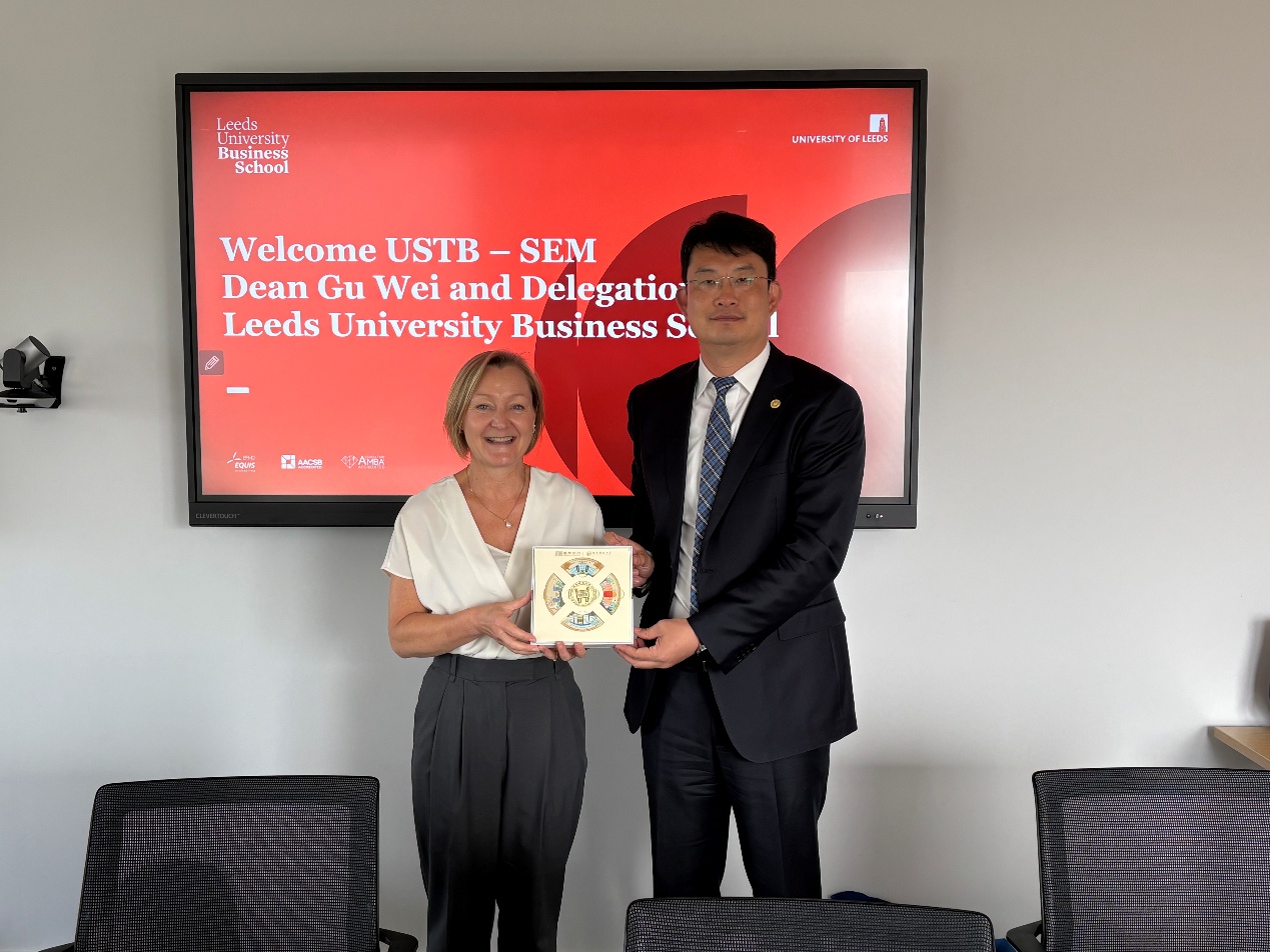 在利兹大学商学院座谈会上,谷炜院长与利兹大学商学院执行院长Julia Bennell教授共同回顾了两院合作历程,尤其是自2024年签署合作协议以来的合作进展。谷炜院长提出两院将进一步深化人才培养、科技创新等领域的合作,共同提升双方商学院的国际化影响力。Julia Bennell院长表示,将在学生联合培养、师生交流互访、科研平台搭建等领域与北科大经管学院深入合作、实现协同创新。