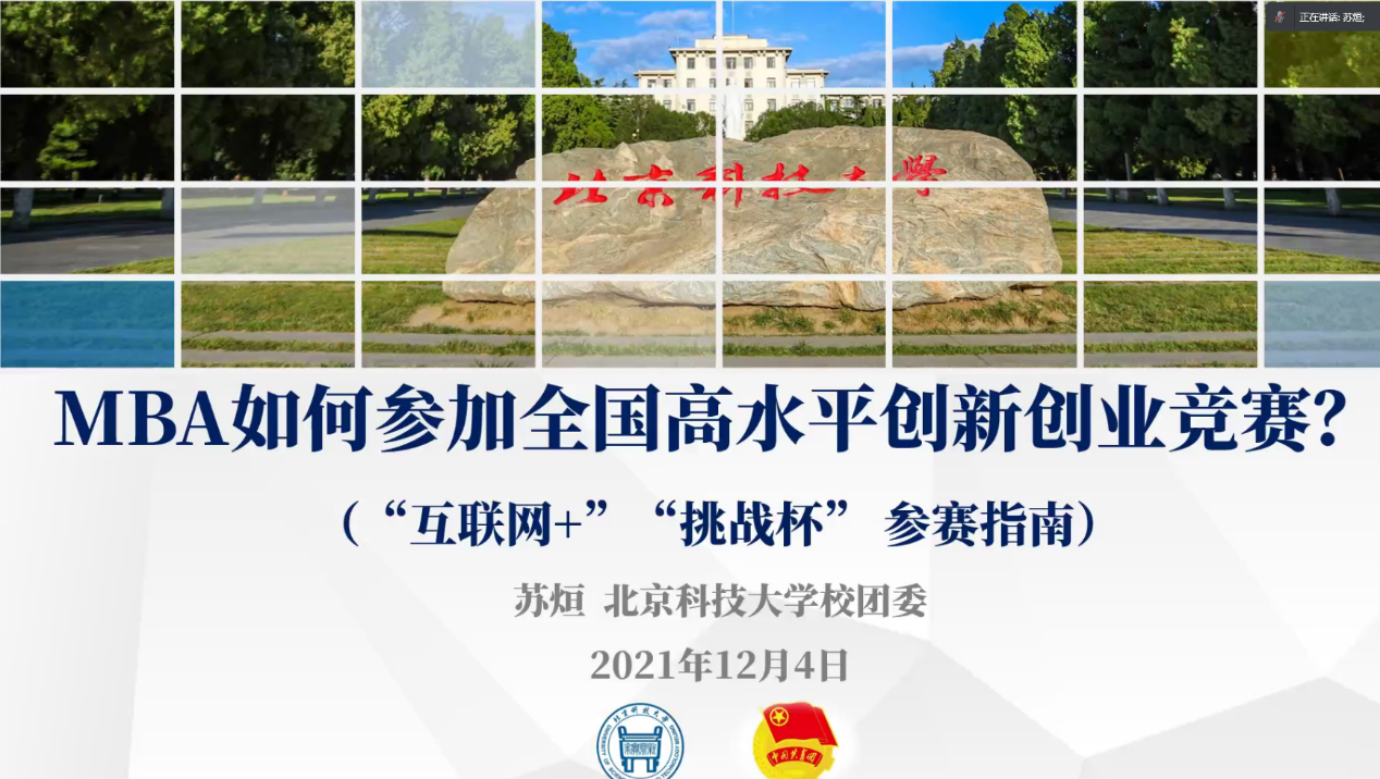 2021年12月4日晚,由经管学院专硕中心主办的“创新创业三大赛事”权威解读活动通过腾讯会议线上平台成功举办,学院创新创业辅导员戈誉阳作为讲座主持人,邀请了beat365英国官方网站校团委副书记苏烜老师对竞赛政策进行了专业解读,2018级MBA校友肖祥应分享了MBA参赛经验和创业经历,孟子居创业团队创始人、负责人杨国庆作为获奖团队代表分享了参赛心得。专硕中心王琛老师、陈欢老师以及近70名专硕同学共同参会。一个半小时的解读,为参会同学诠释了什么是创新创业三大赛、为什么三大赛含金量如此之高、参赛带来的众多收获,极大提高了同学们参赛热情。